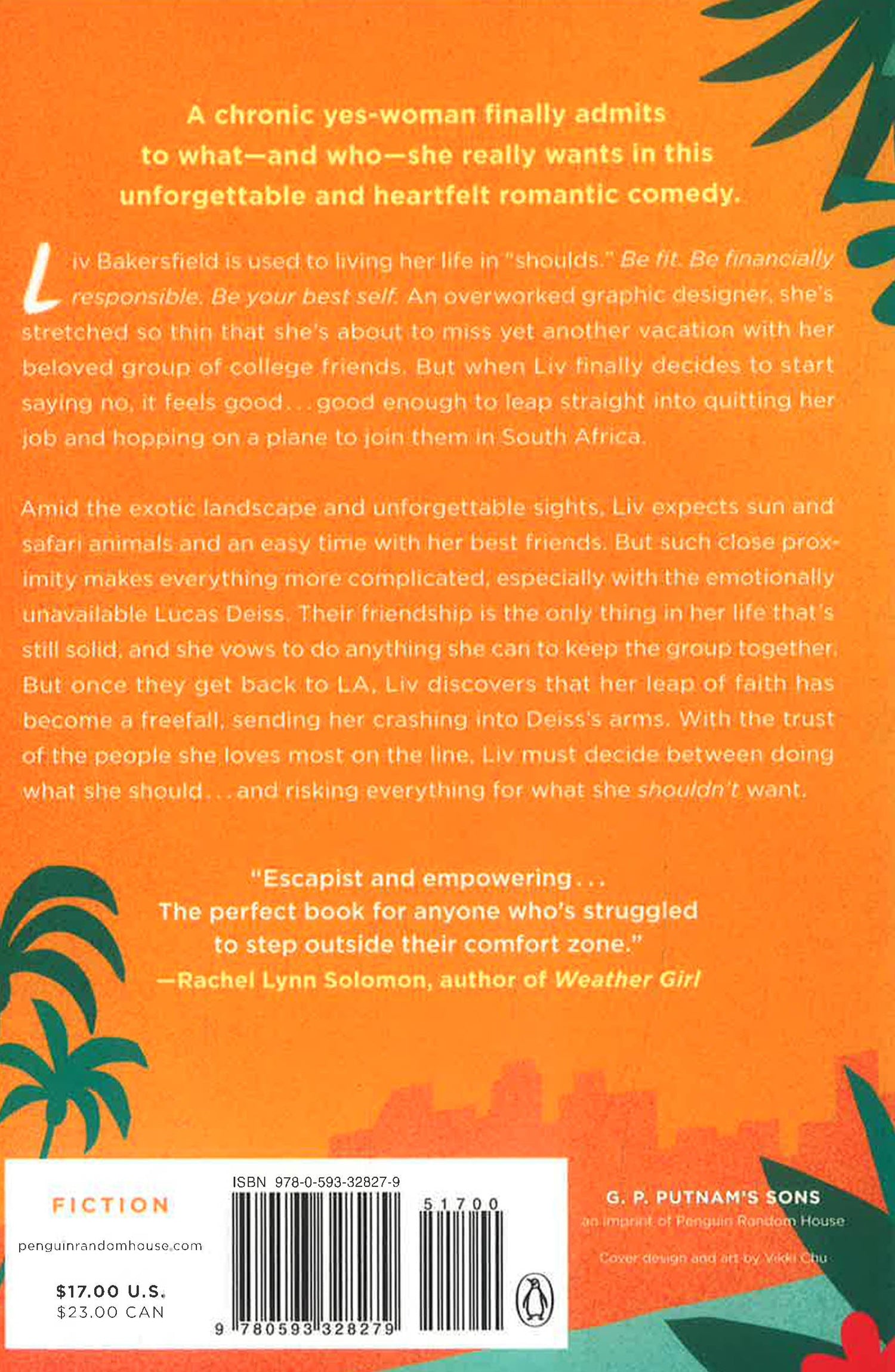 Liv Bakersfield is used to living her life in “shoulds.” Be fit. Be financially responsible. Be your best self. An overworked graphic designer, she’s stretched so thin that she’s about to miss yet another vacation with her beloved group of college friends. But when Liv finally decides to start saying no, it feels good…good enough to leap straight into quitting her job and hopping on a plane to join them in South Africa.