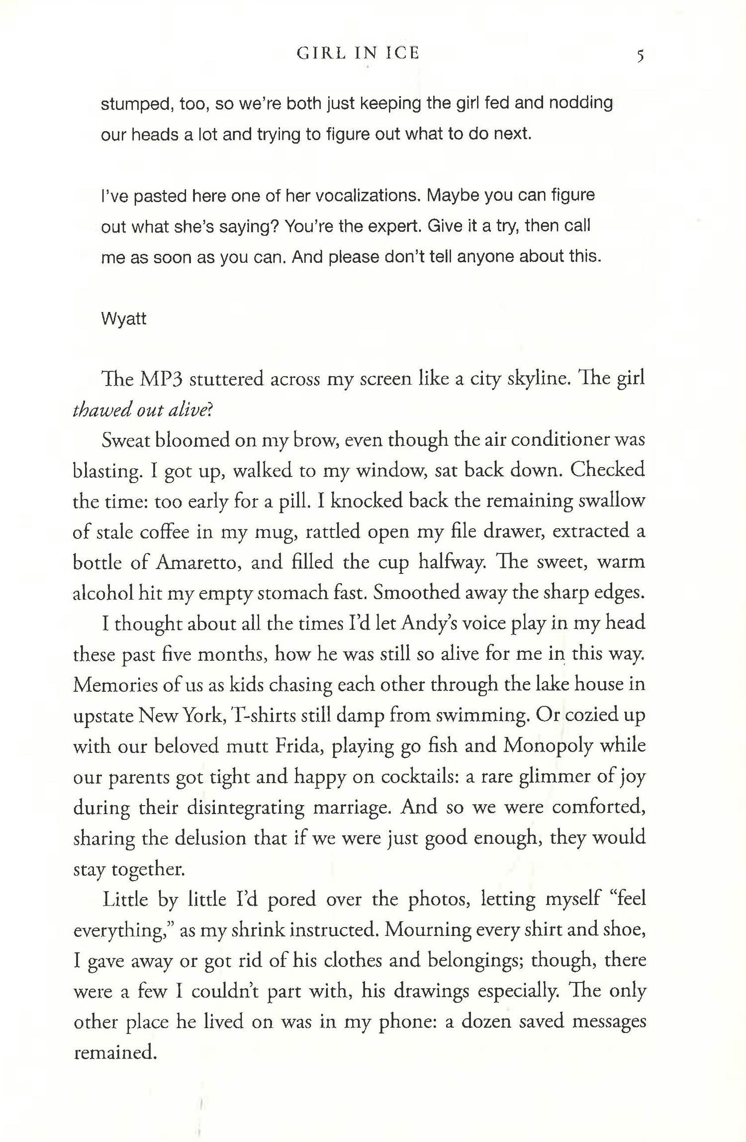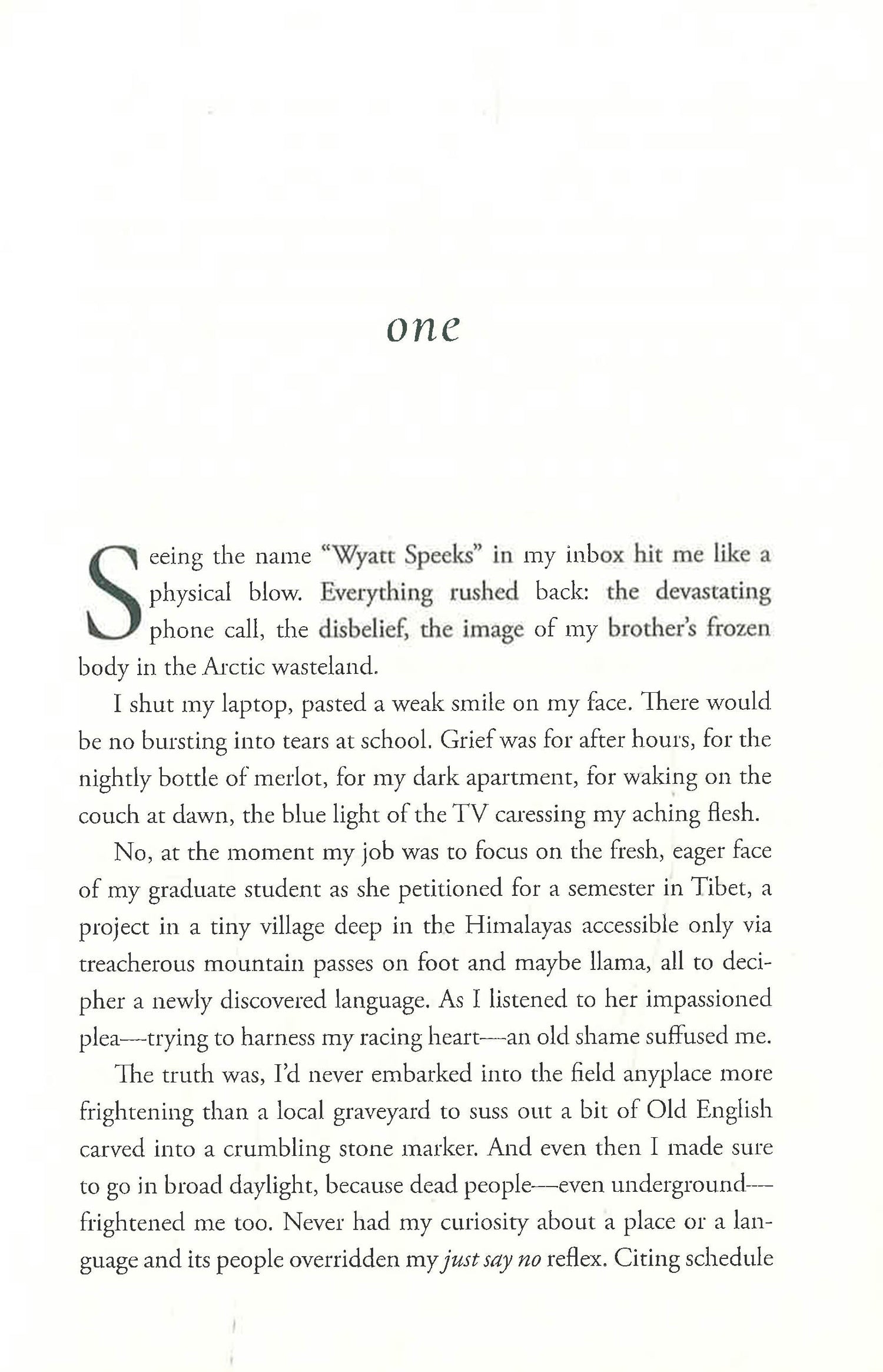When Wyatt, Andy’s fellow researcher in the Arctic, discovers a scientific impossibility—a young girl frozen in the ice who thaws out alive, speaking a language no one understands—Val is his first call. Will she travel to the frozen North to meet this girl, and try to comprehend what she is so passionately trying to communicate? Under the auspices of helping Wyatt interpret the girl’s speech, Val musters every ounce of her courage and journeys to the Artic to solve the mystery of her brother’s death.