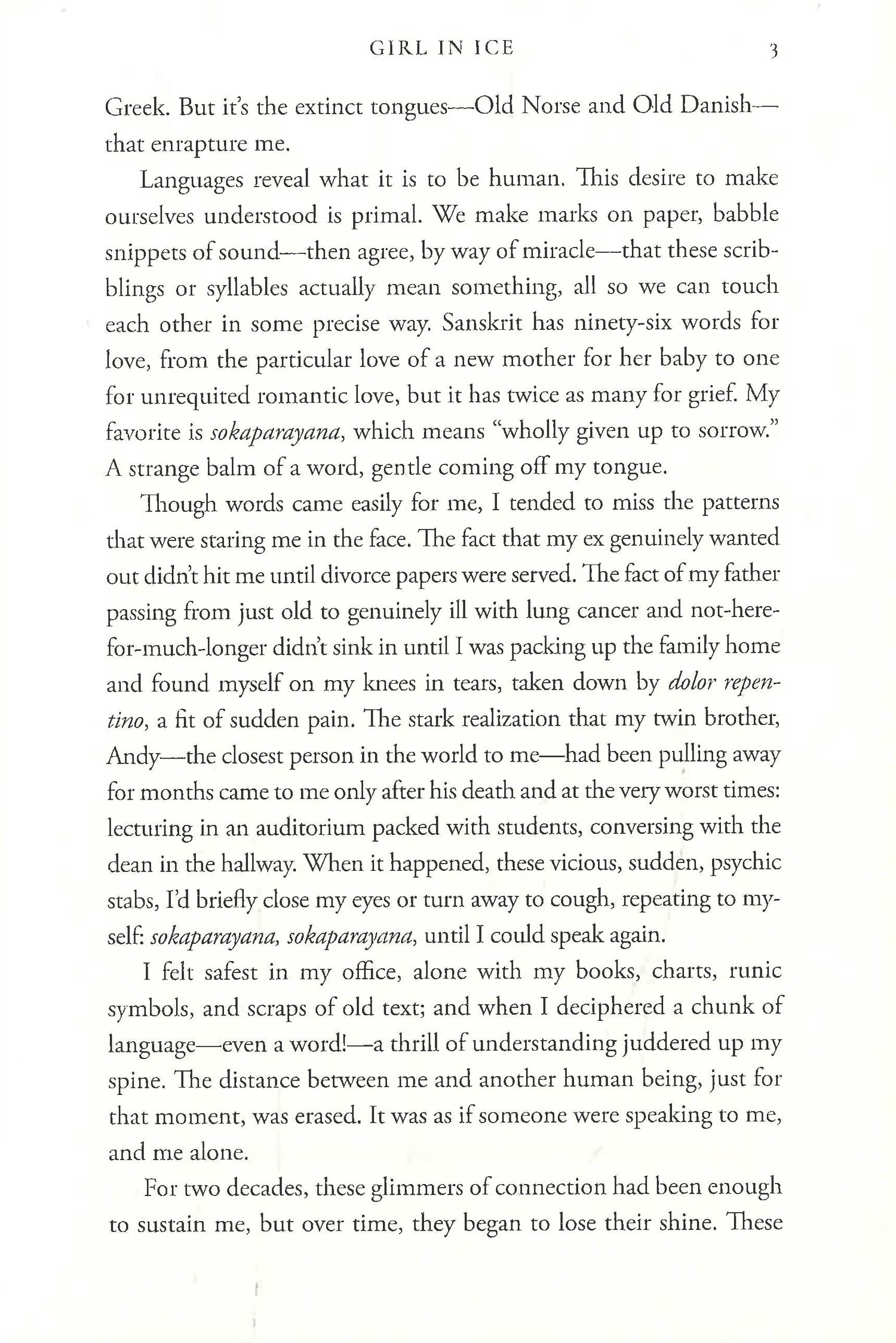 Valerie “Val” Chesterfield is a linguist trained in the most esoteric of disciplines: dead Nordic languages. Despite her successful career, she leads a sheltered life and languishes in the shadow of her twin brother, Andy, an accomplished climate scientist stationed on a remote island off Greenland’s barren coast. But Andy is gone: a victim of suicide, having willfully ventured unprotected into 50 degree below zero weather. Val is inconsolable—and disbelieving. She suspects foul play.
