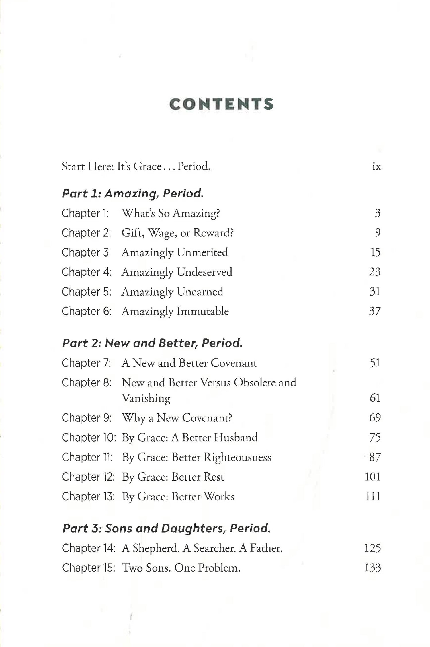 In other words, Grace, Period. is a clear and compelling roadmap for arriving at an end to striving and shame. It's a guide for finding and enjoying the abundant life God sent Jesus to purchase for us. A life given to us by grace-only grace.