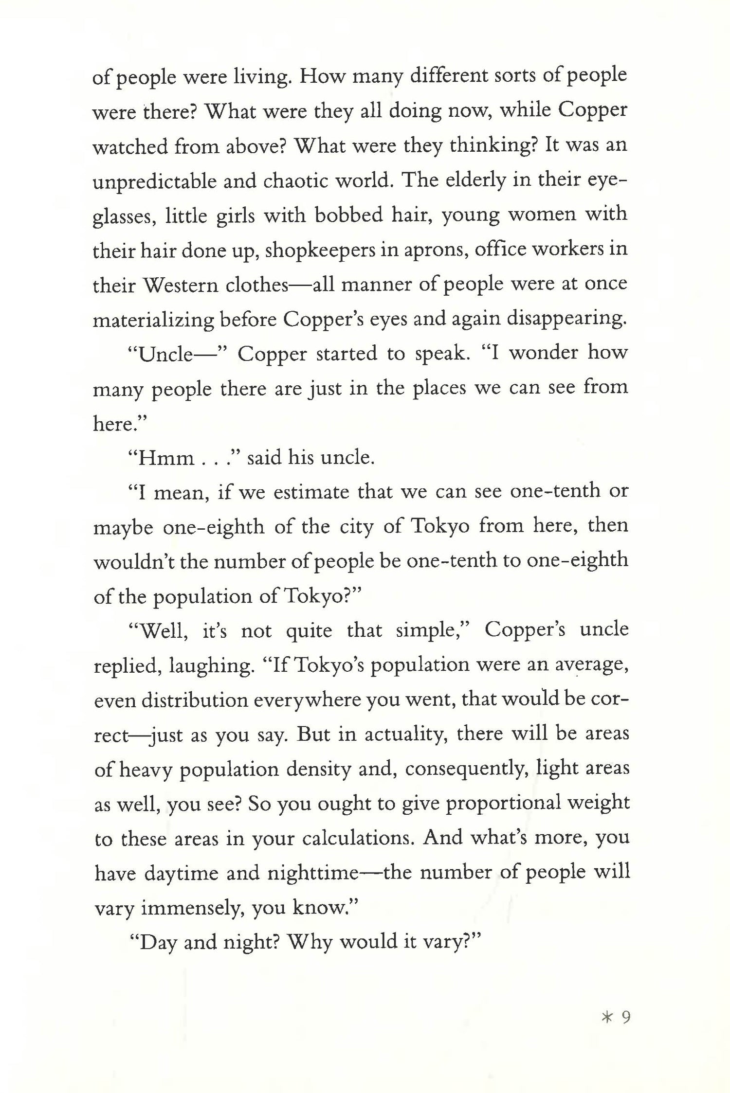 How Do You Live? is narrated in two voices. The first belongs to Copper, fifteen, who after the death of his father must confront inevitable and enormous change, including his own betrayal of his best friend. In between episodes of Copper’s emerging story, his uncle writes to him in a journal, sharing knowledge and offering advice on life’s big questions as Copper begins to encounter them. Over the course of the story, Copper, like his namesake Copernicus, looks to the stars, and uses his discoveries about the heavens, earth, and human nature to answer the question of how he will live.