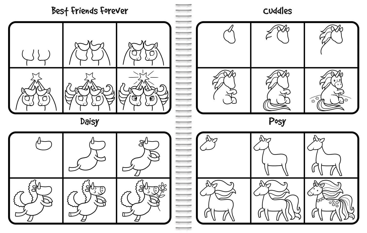 From sleeping unicorns, adorable unicorns and unicorn friends to foals, racing horses and different horse breeds, there are 101 horses and unicorns to learn to draw. Since each image is broken down into six simple steps, children will quickly gain in confidence when they see their finished results, and will soon be adapting their designs and drawing freehand pictures of their own. Ideal for junior artists age 5+.
