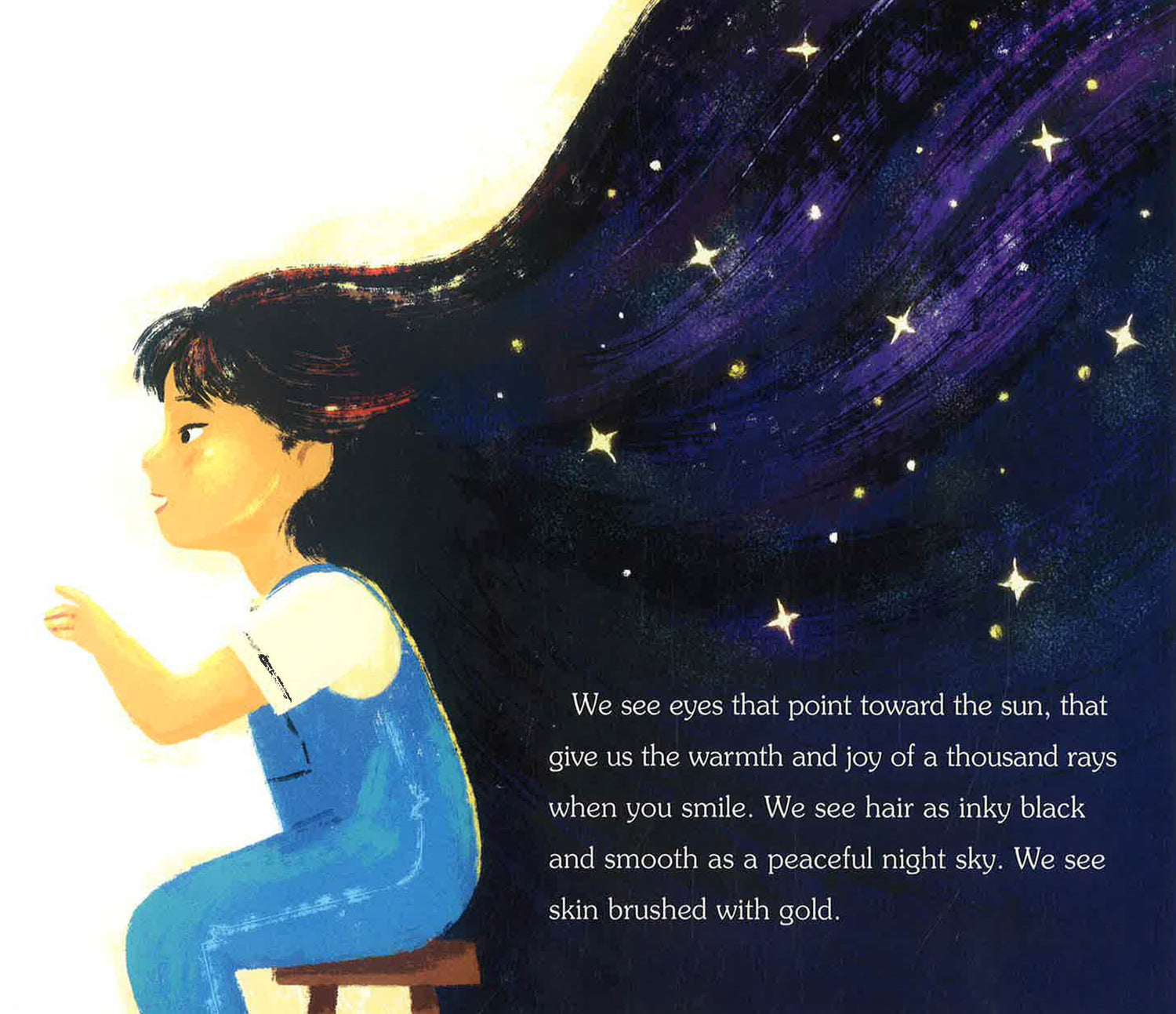 We see eyes that point toward the sun, that give us the warmth and joy of a thousand rays when you smile. We see hair as inky black and smooth as a peaceful night sky. We see skin brushed with gold.