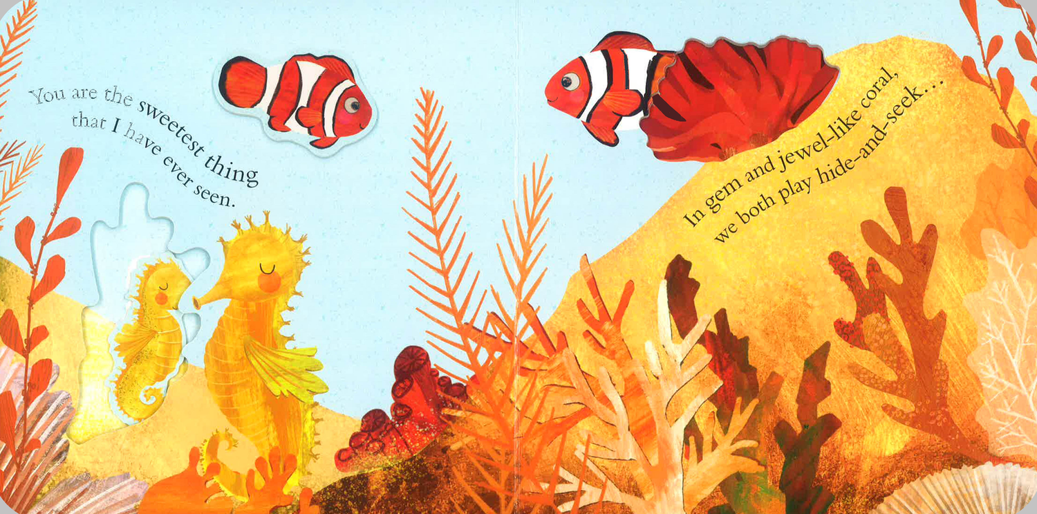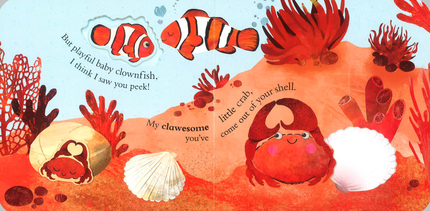 This engaging board book takes readers on a journey through the ocean to meet adorable animal families, from turtles, seahorses, and clownfish to crabs, sea stars, and sea jellies. Each adult animal reassures the younger animal of their love as they snuggle up together. Features a die cut on the front cover as well as a die cut on each page that figures into the storyline.