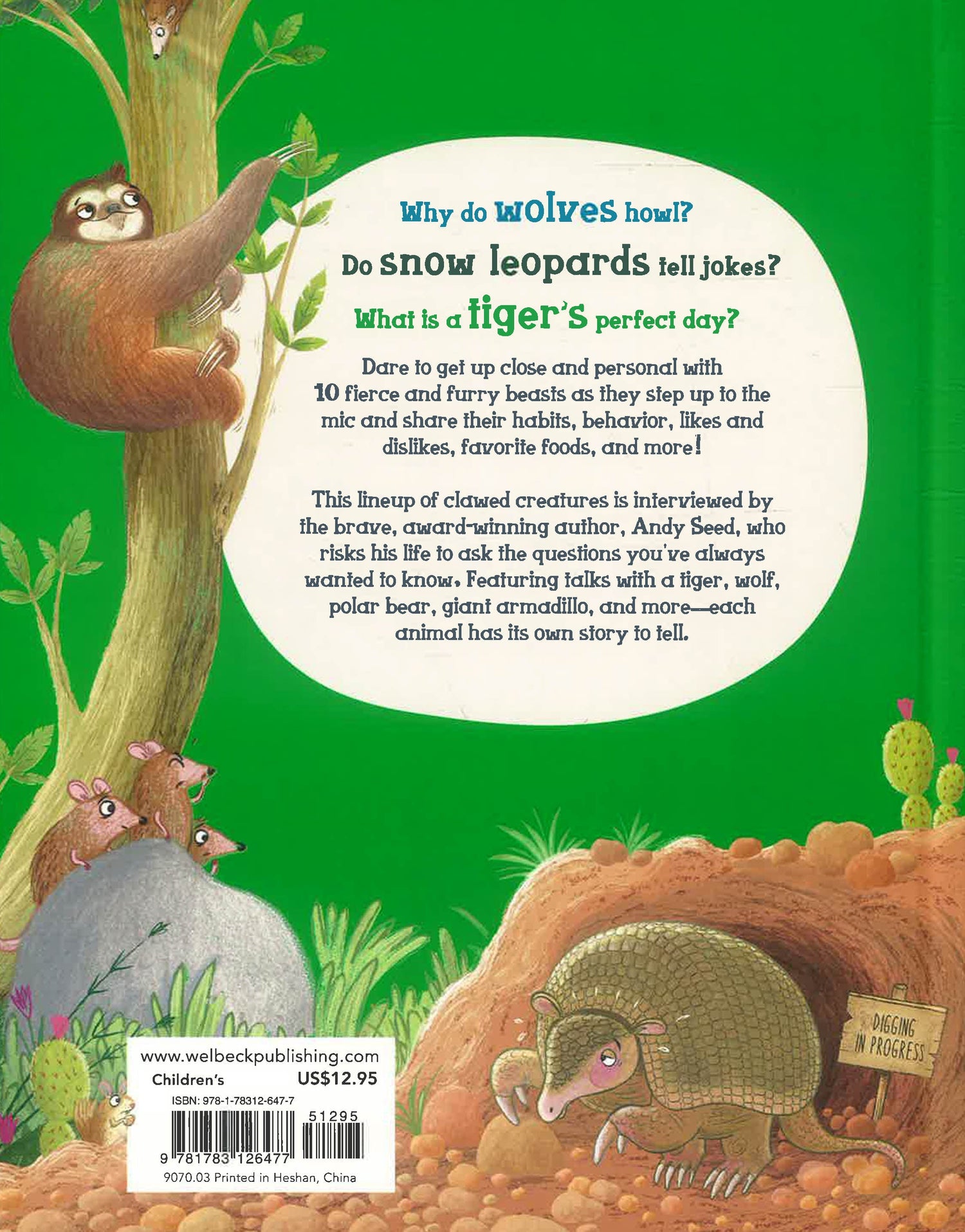 Features 'interviews' with a tiger, wolf, honey badger, giant armadillo, lion, jaguar, giant anteater, snow leopard, polar bear, and three-toed sloth. Plus, ideas for how to do your bit to help endangered species and their habitats.