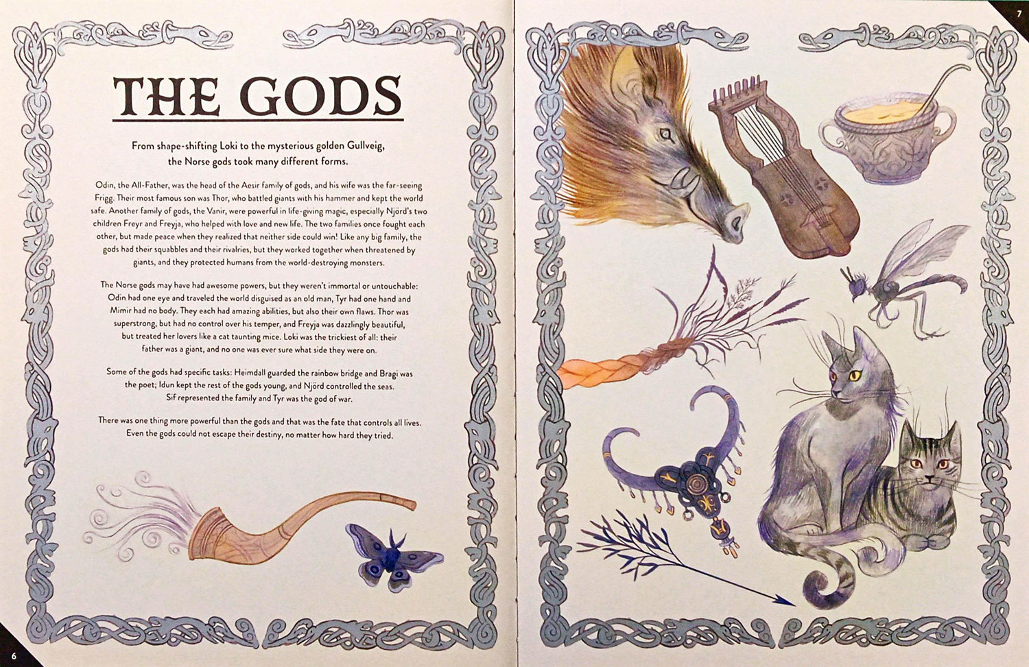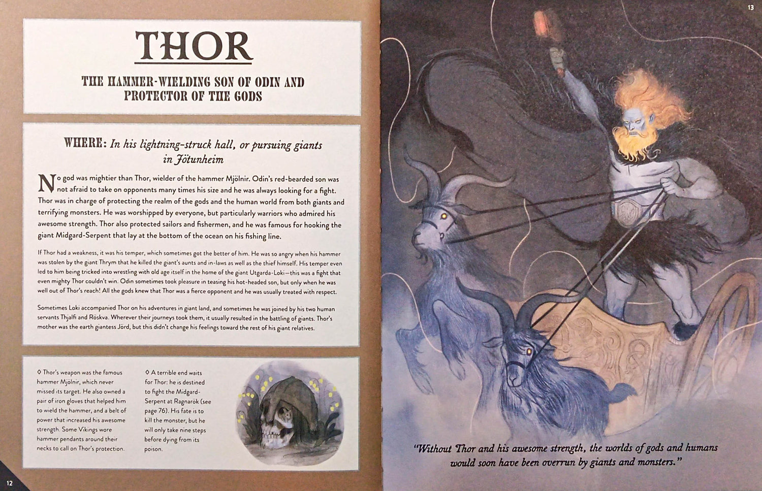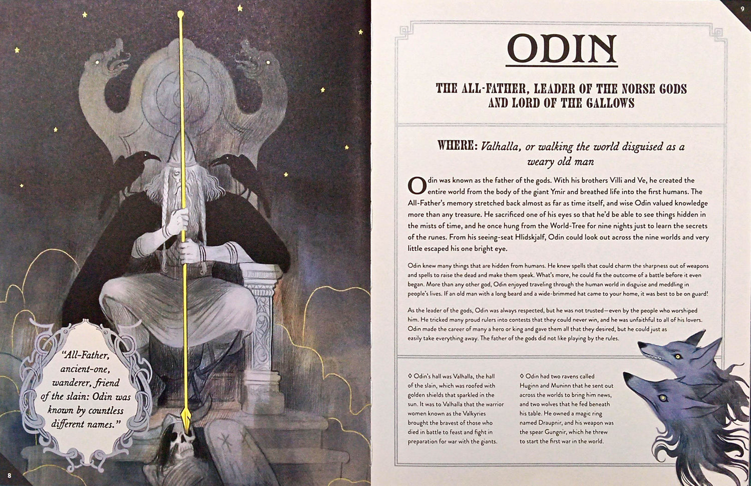 Inside, there are more than 30 profiles of Norse figures - from gods and goddesses, to giants, elves, monsters and other mythical beings. Each profile introduces the figure, including their defining attributes and a new retelling of their story, along with sidelights of extra facts and details. Figures include familiar gods like Thor to lesser-known legends such as giant sisters Gjálp and Greip.