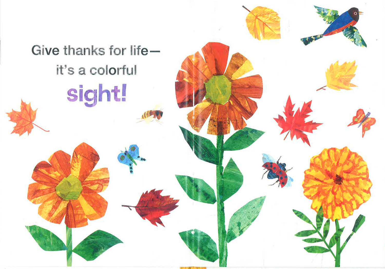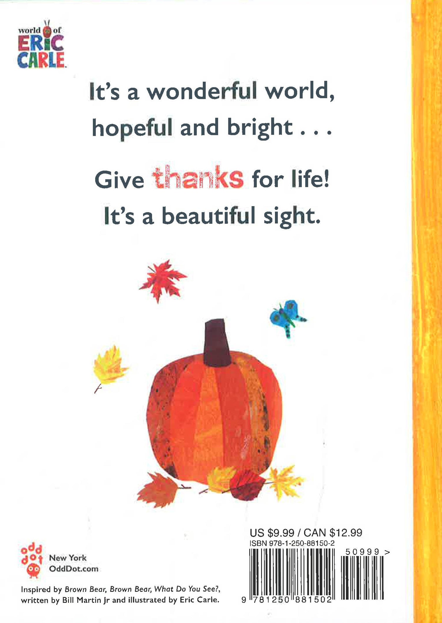 At Thanksgiving and all year long, this rhyming, read-aloud is perfect for sharing. It's a gentle reminder to appreciate the beauty and abundance of our wonderful world. With new original text and exciting original use of art from the World of Eric Carle collection, it's a very special gratitude practice in a book--and the perfect way to say thanks.