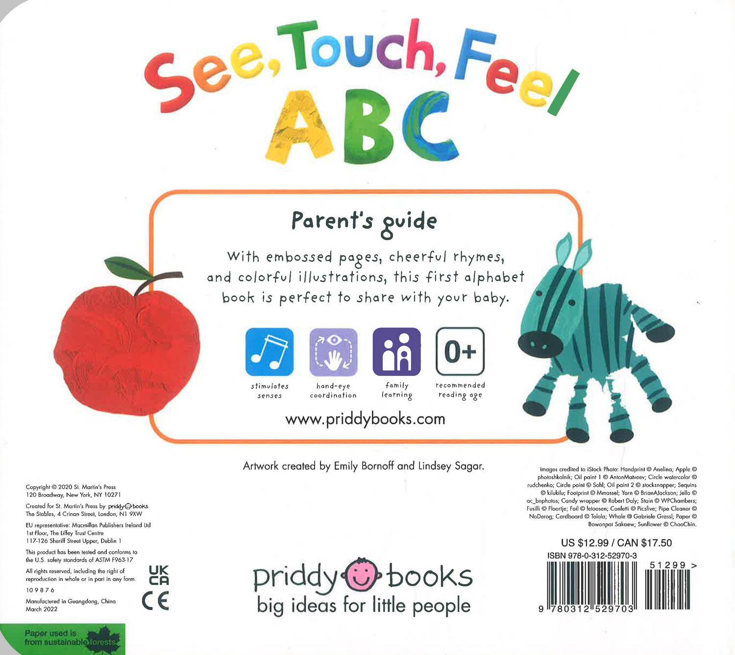 There's lots for toddlers to explore in See, Touch, Feel: ABC. Following on from Priddy's exciting new title See, Touch, Feel: Create, publishing in Fall 2019, this sturdy board book is specially designed to stimulate toddlers through creative pictures and help them learn first words.