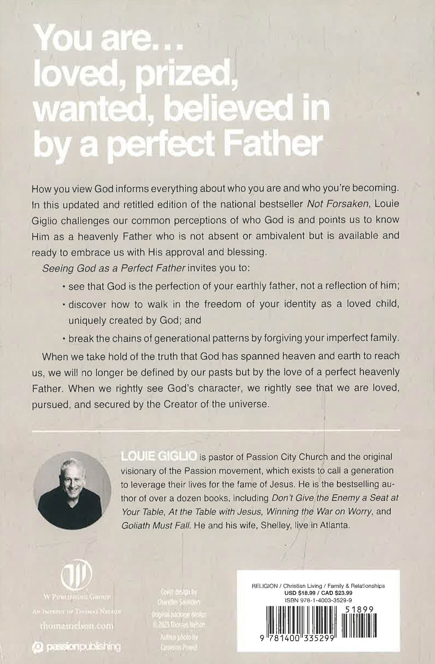You are chosen, loved, and wanted! In this update to Giglio's national bestseller Not Forsaken, he invites you to live under God's waterfall of blessing as you experience him as a life-changing Father. Let go of the past by embracing the Lord of eternity who spanned Heaven and Earth to reach you. 256 pages, softcover from Nelson.