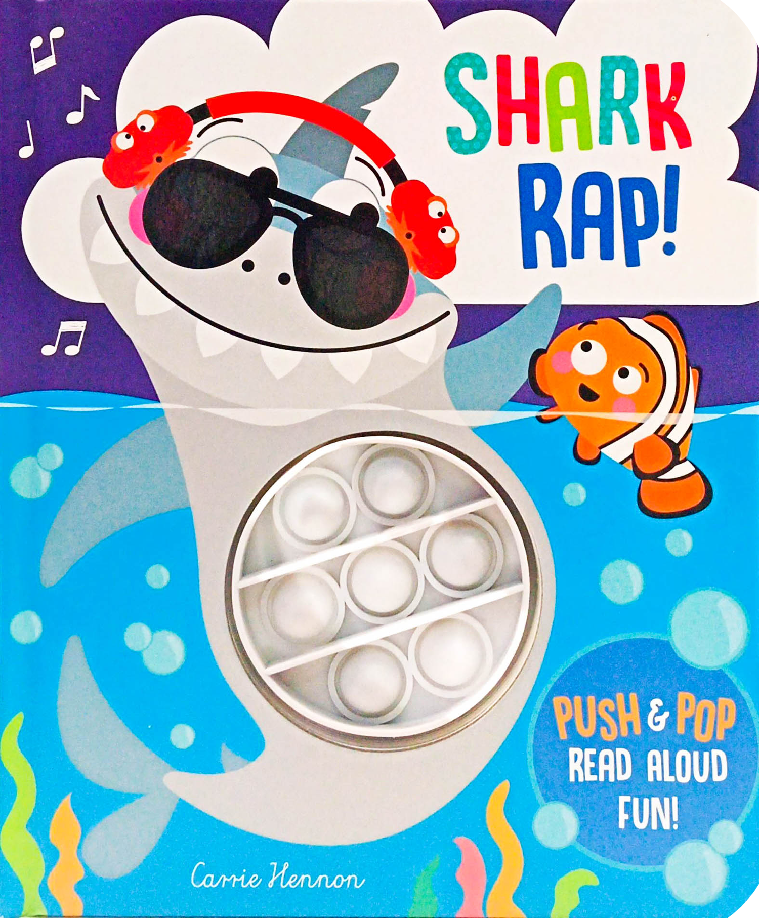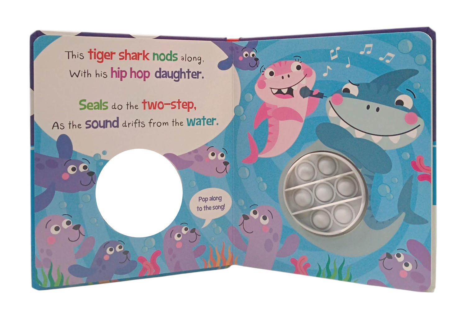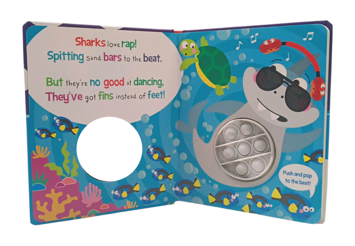 In this snappy story about singing and rapping sharks, there's an innovative silicone popper fidget toy for little hands to push, pop, and explore on each page as the rhyming story is read aloud.