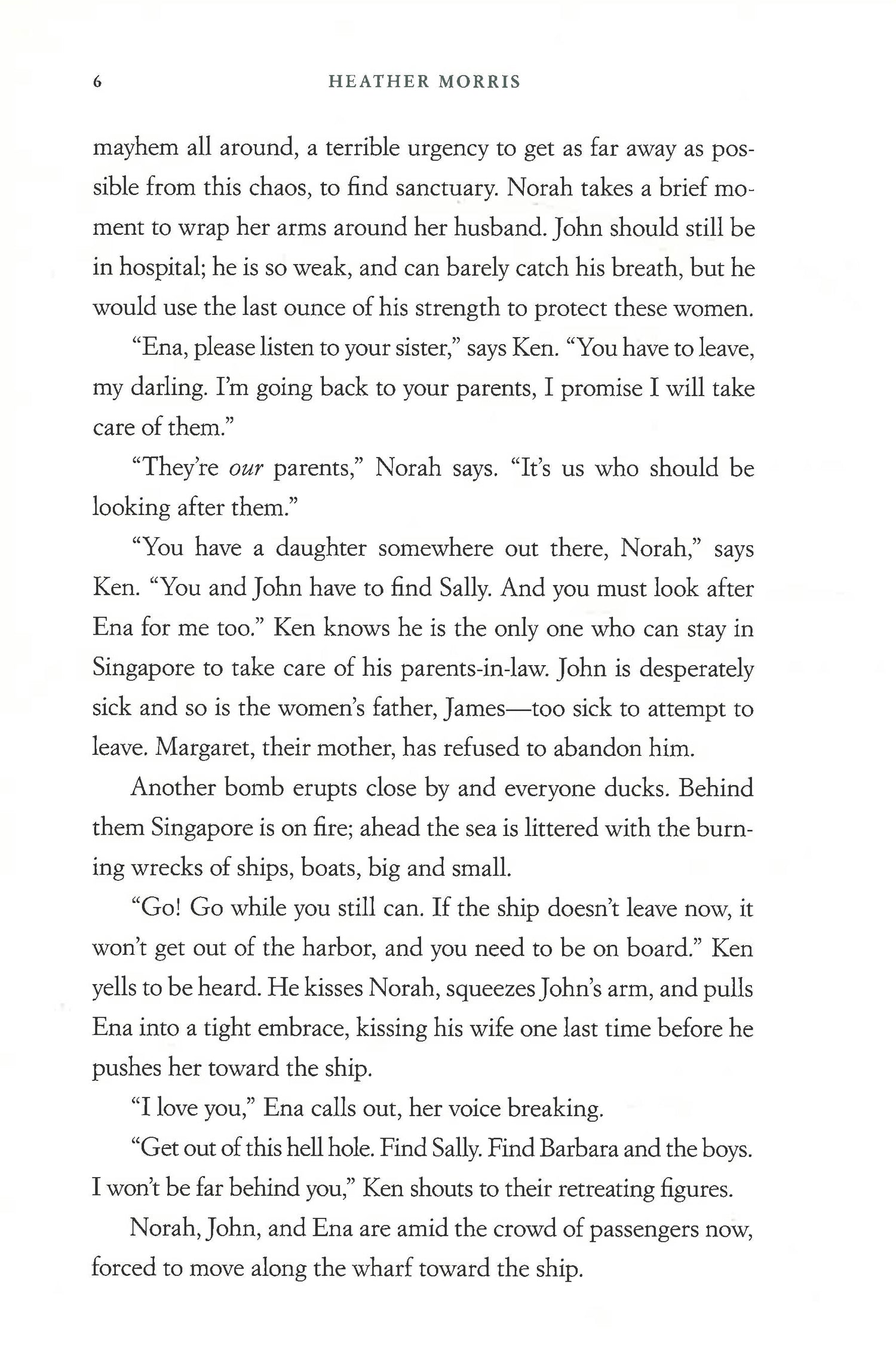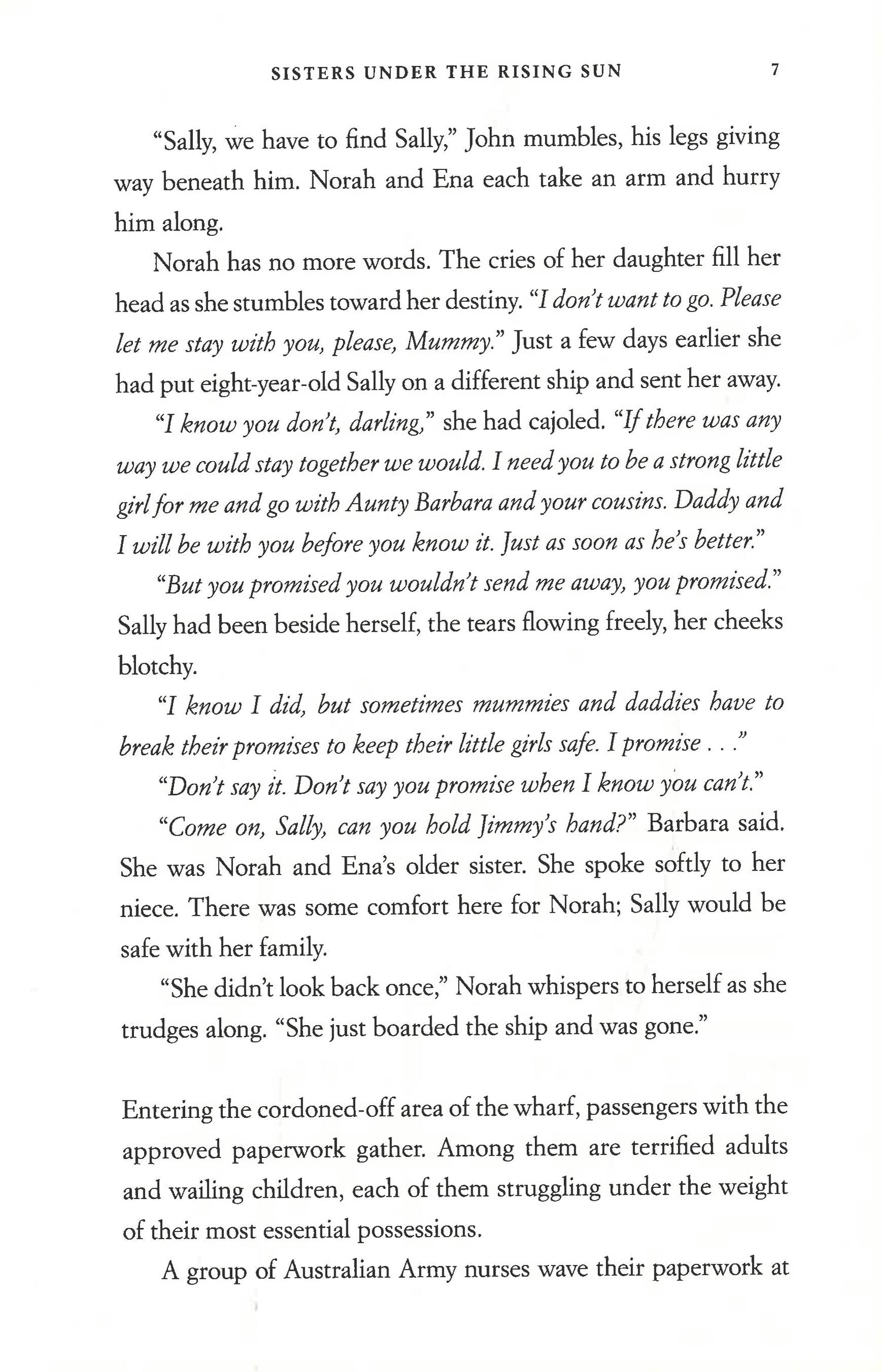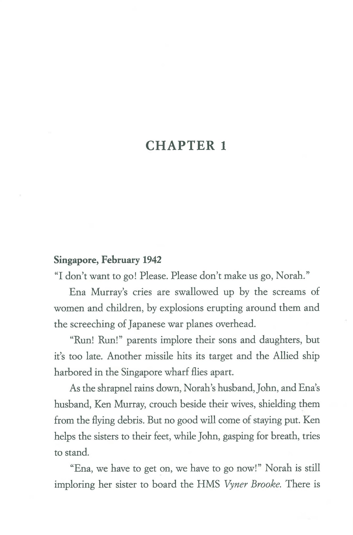 After surviving a brutal 24 hours in the sea, Nesta and Norah reach the beaches of a remote island, only to be captured by the Japanese and held in one of their notorious POW camps. The camps are places of starvation and brutality, where disease runs rampant. Sisters in arms, Norah and Nesta fight side by side every day, helping whoever they can, and discovering in themselves and each other extraordinary reserves of courage, resourcefulness and determination.