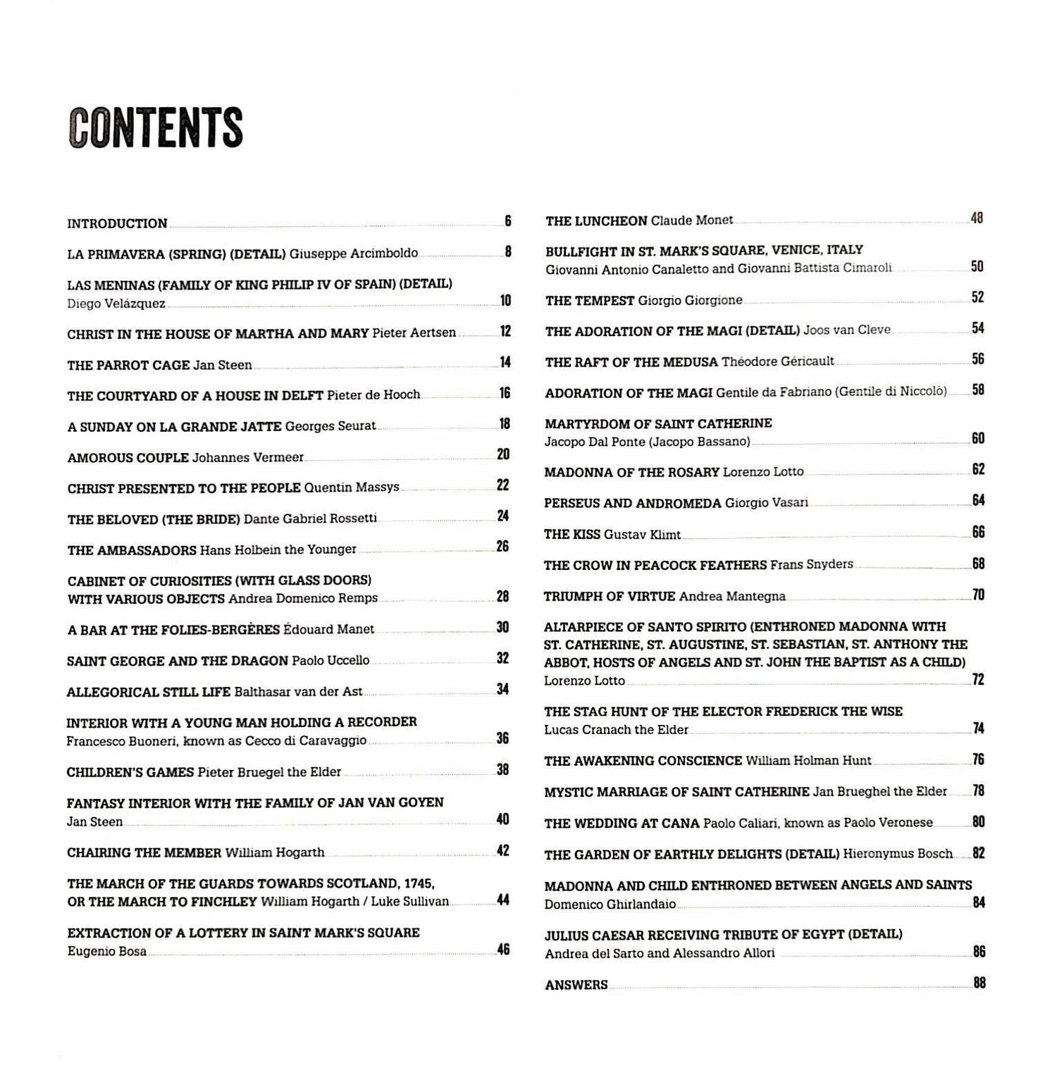 Great paintings, with their beautiful and sometimes hidden details, deserve a closer look. So open your eyes and see if you can spot the differences in each of these 40 ingenious fine-art puzzles. Every spread features two versions of a famous masterpiece—the original on the left and one with 20 subtle changes on the right. That comes to 800 changes altogether! So lose yourself in the iconography of Renaissance Florence, the still lifes of the Dutch masters, the Paris of the Impressionists, and more.