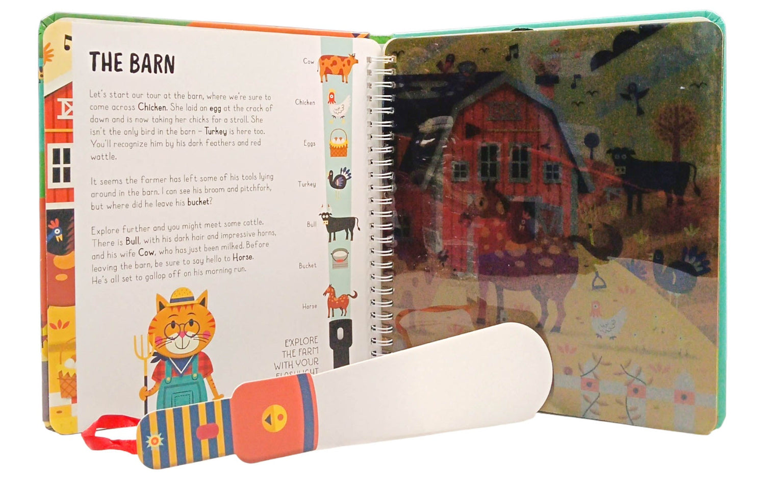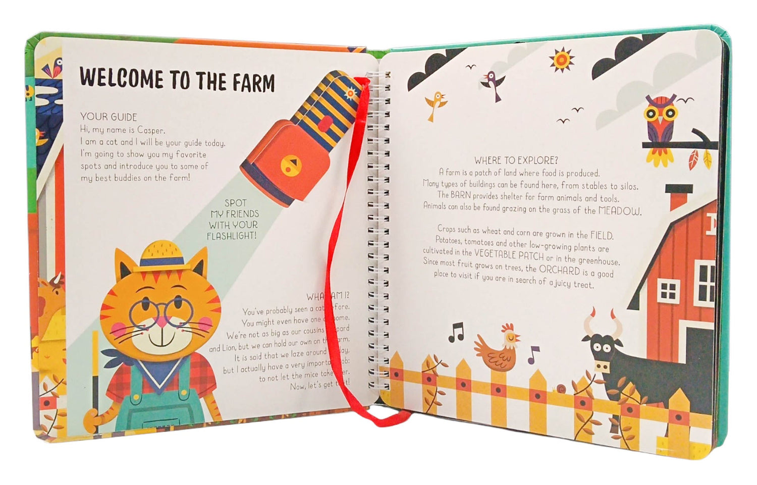 Young explorers will enjoy this spotlight discovery! In every book, a personal guide will help children in their search through all different kinds of farm animals. A cardboard cut-out flashlight is included to shine behind the dark acetate and reveal illustrations!