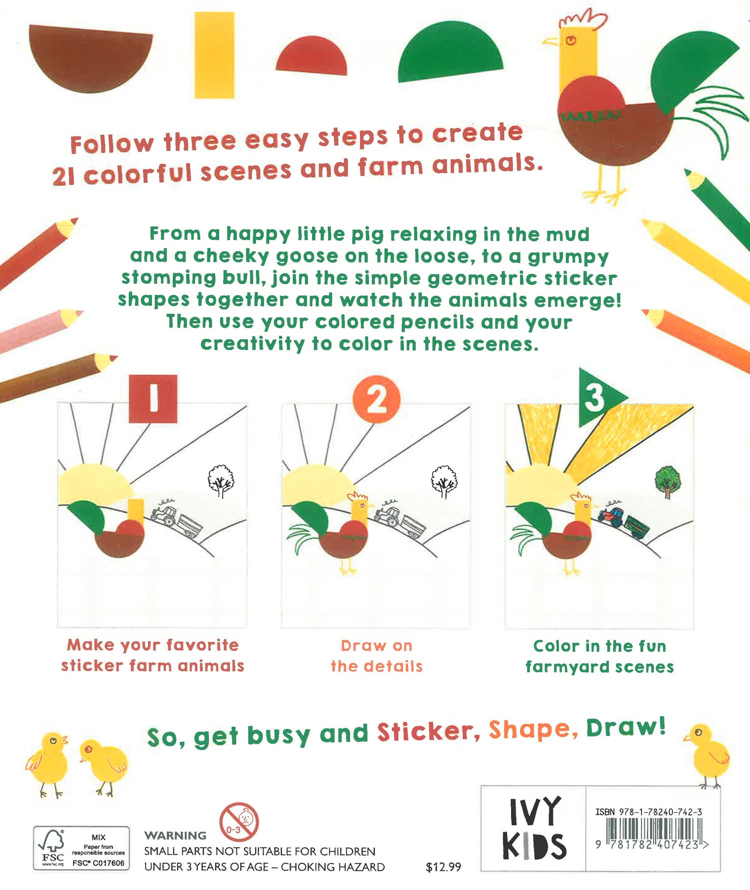 Using simple sticker shapes, children add all their favorite animals to the farmyard—cats, horses, pigs, sheep, cows, rabbits, goats, and chickens... there’s even a goose on the loose! Featuring 20 ready-drawn background scenes to populate as well as seven sheets of draw-on stickers, Sticker Shape Draw: On the Farm is a super-fun creative package—all children need to bring are pens or pencils and their own imaginations. Packed with engaging farmyard characters to construct and decorate, Sticker Shape Draw: On the Farm will keep kids (and parents too!) busy stickering and drawing for hours.