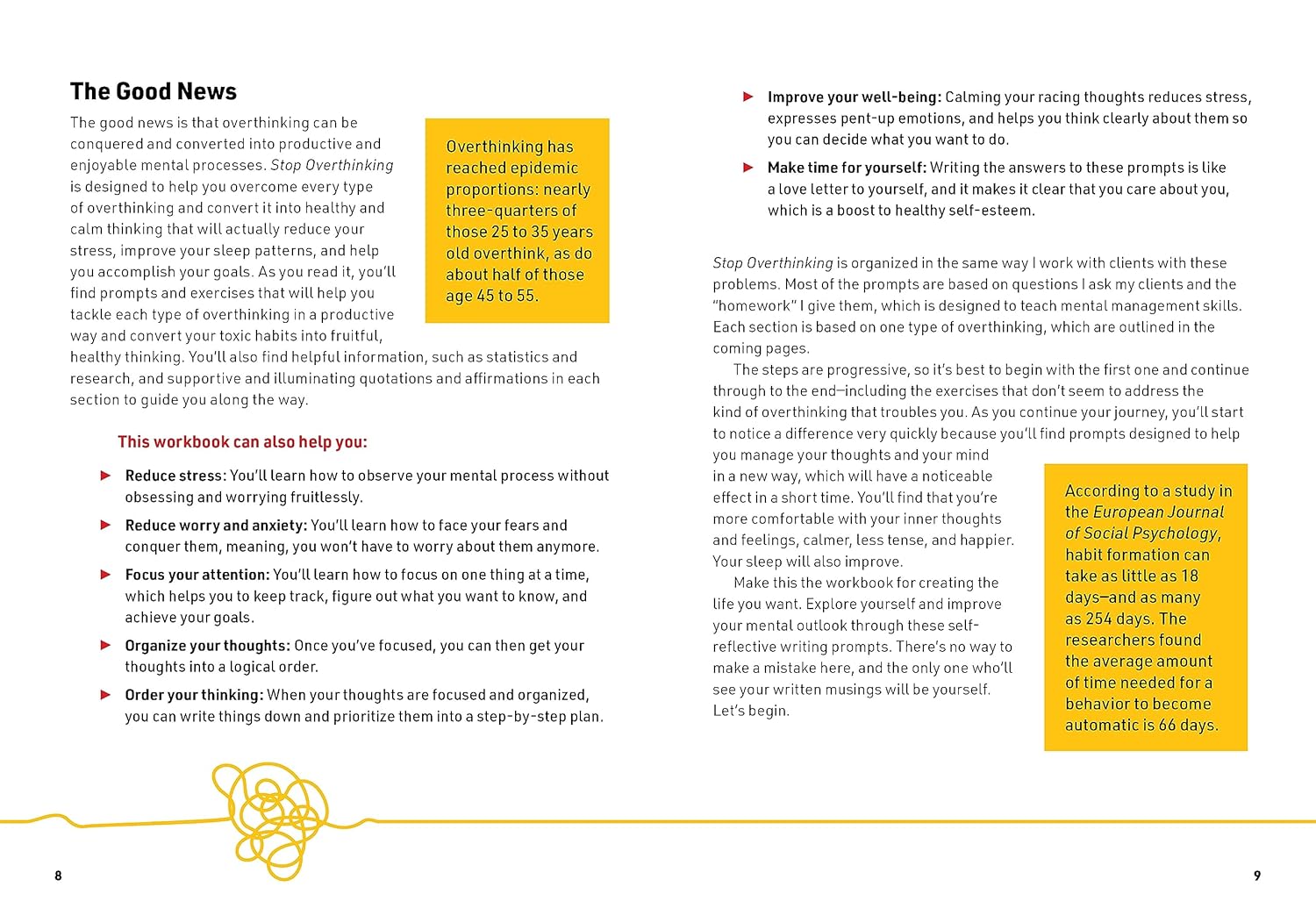 Within each chapter are 10 steps, in the form of writing prompts and exercises, that will help you tackle whatever type of overthinking is causing your mind to run on autopilot. Designed to help you manage your thoughts and your mind in a new way, they will convert your spiraling thought habits into productive, healthy thinking―which will ultimately improve your sleep and well-being; reduce stress, worry, and anxiety; and help you to become focused and accomplish your goals.