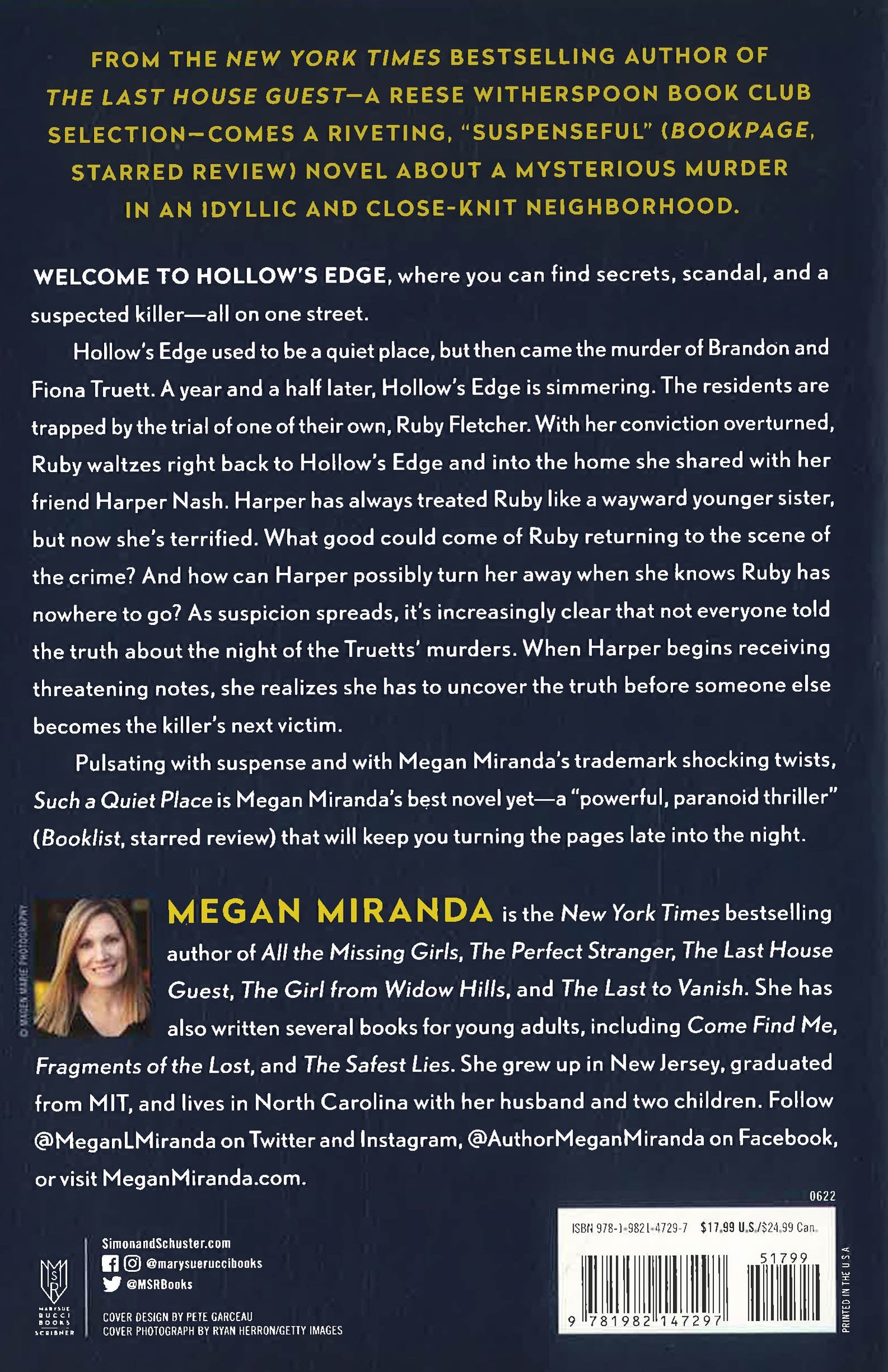 Pulsating with suspense and with Megan Miranda’s trademark shocking twists, Such a Quiet Place is Megan Miranda’s best novel yet—a “powerful, paranoid thriller” (Booklist, starred review) that will keep you turning the pages late into the night.