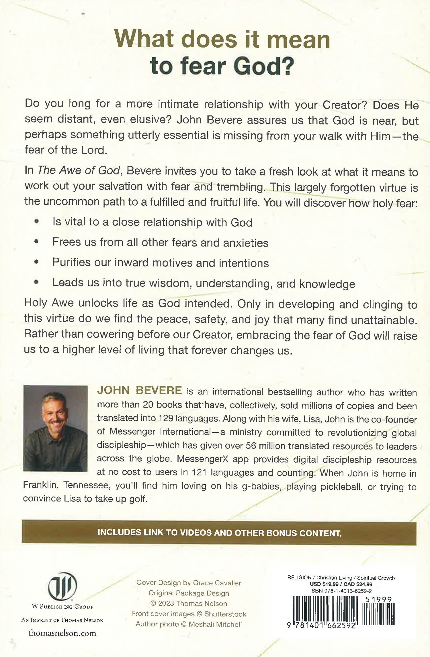 In The Awe of God, John Bevere invites you to take a fresh look at what it means to work out your salvation with fear and trembling. This healthy, holy, and largely forgotten virtue is the uncommon path to a more fulfilled and fruitful spiritual life. In this book you will see why godly fear is the foundation of: