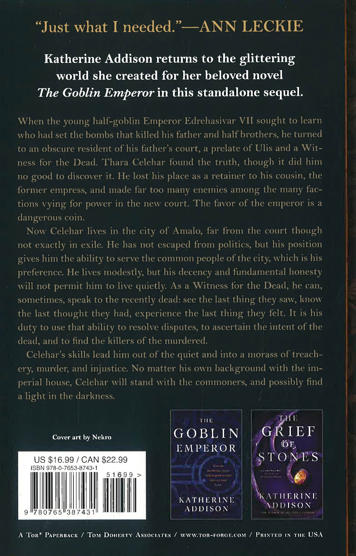 When the young half-goblin emperor Maia sought to learn who had set the bombs that killed his father and half-brothers, he turned to an obscure resident of his father’s Court, a Prelate of Ulis and a Witness for the Dead. Thara Celehar found the truth, though it did him no good to discover it. He lost his place as a retainer of his cousin the former Empress, and made far too many enemies among the many factions vying for power in the new Court. The favor of the Emperor is a dangerous coin.