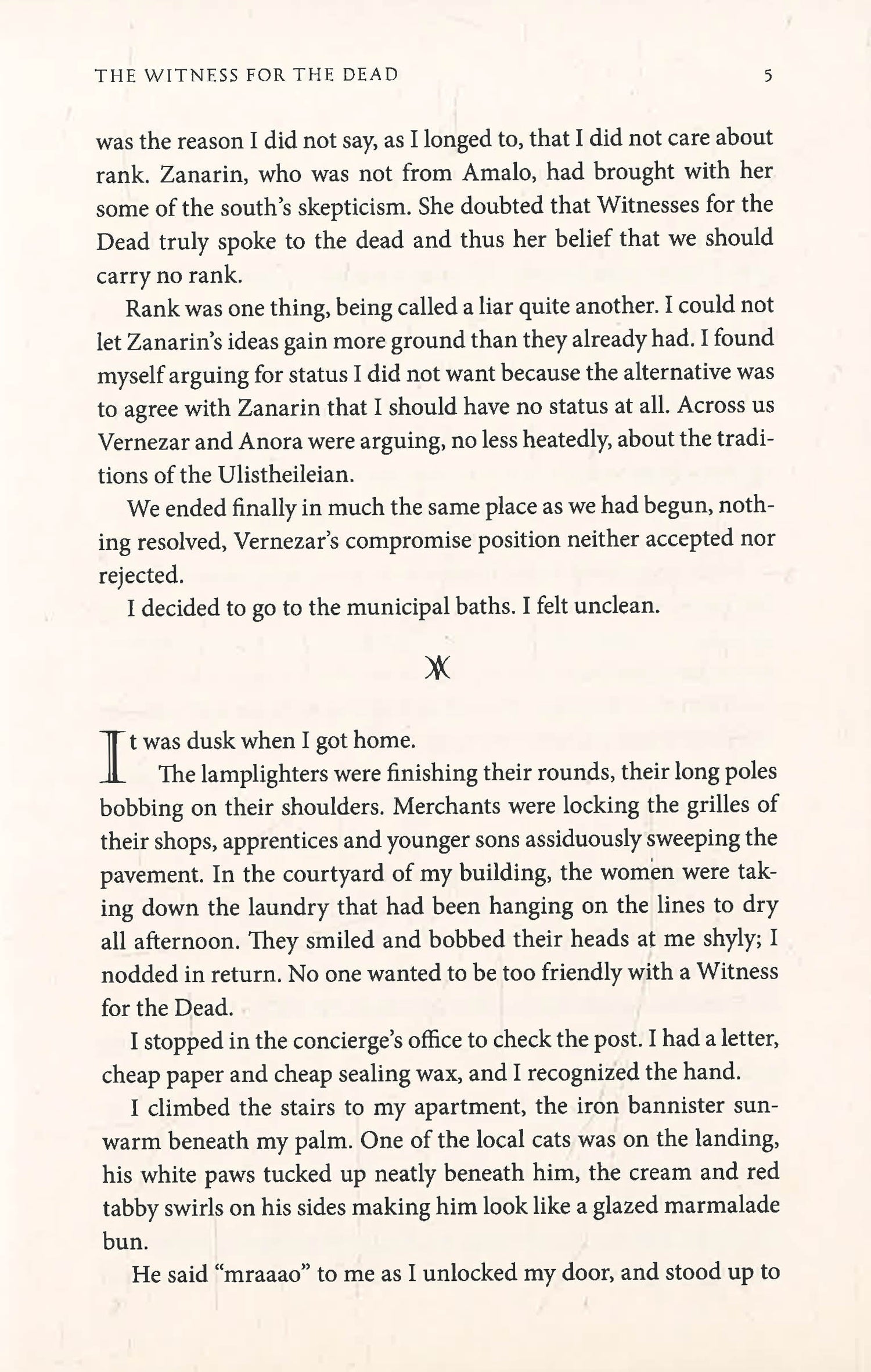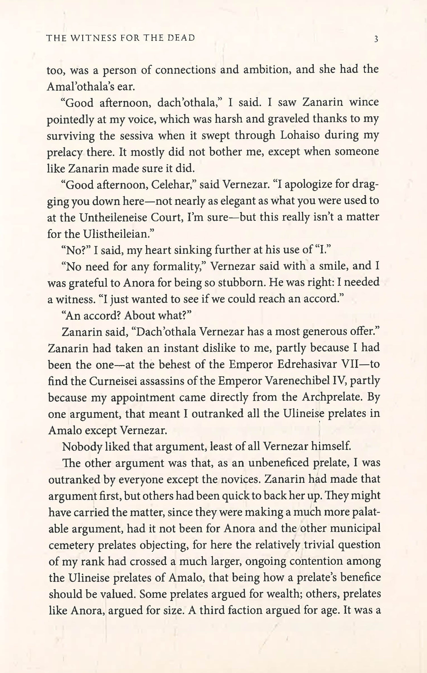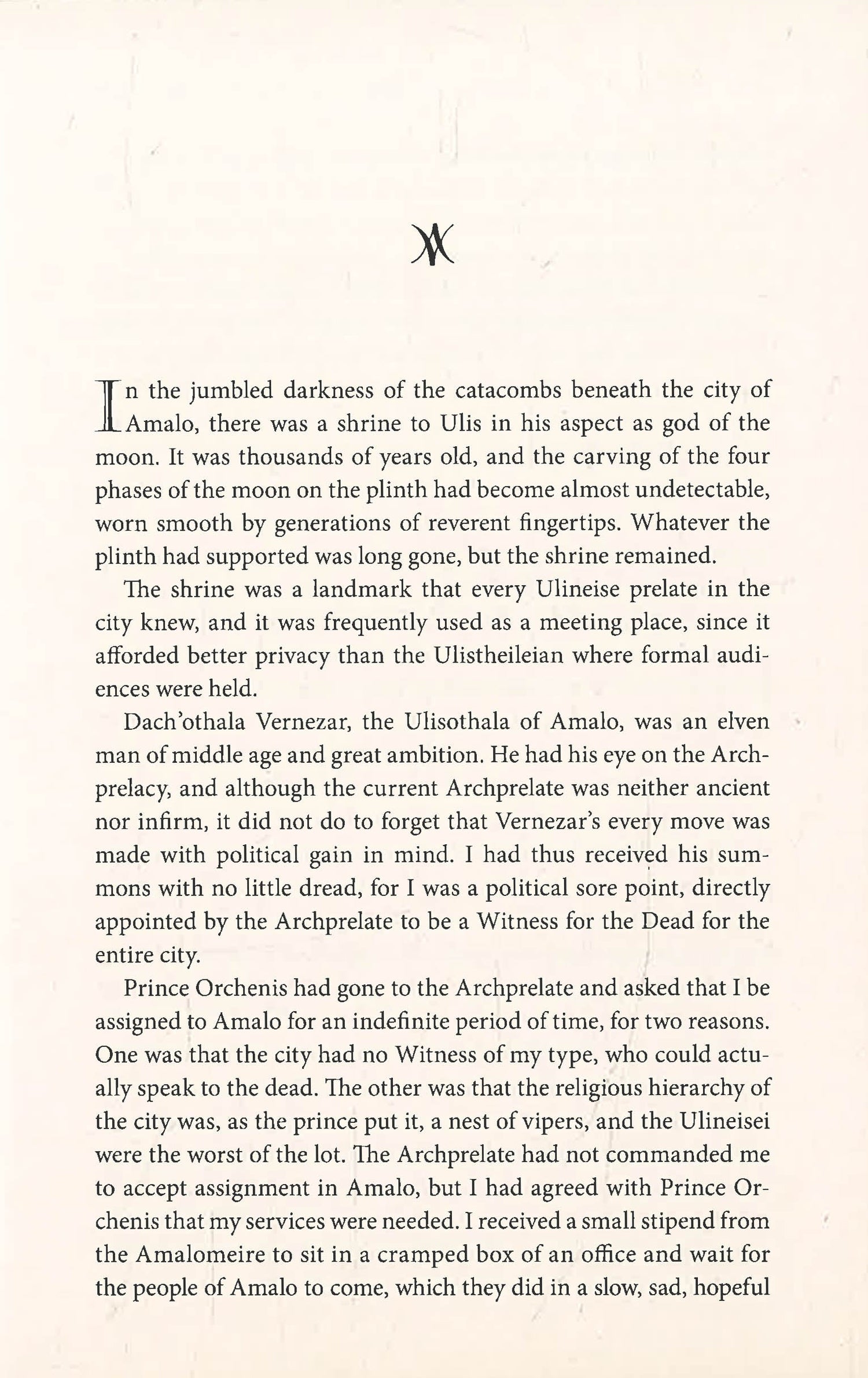 Now Celehar lives in the city of Amalo, far from the Court though not exactly in exile. He has not escaped from politics, but his position gives him the ability to serve the common people of the city, which is his preference. He lives modestly, but his decency and fundamental honesty will not permit him to live quietly. As a Witness for the Dead, he can, sometimes, speak to the recently dead: see the last thing they saw, know the last thought they had, experience the last thing they felt. It is his duty use that ability to resolve disputes, to ascertain the intent of the dead, to find the killers of the murdered.