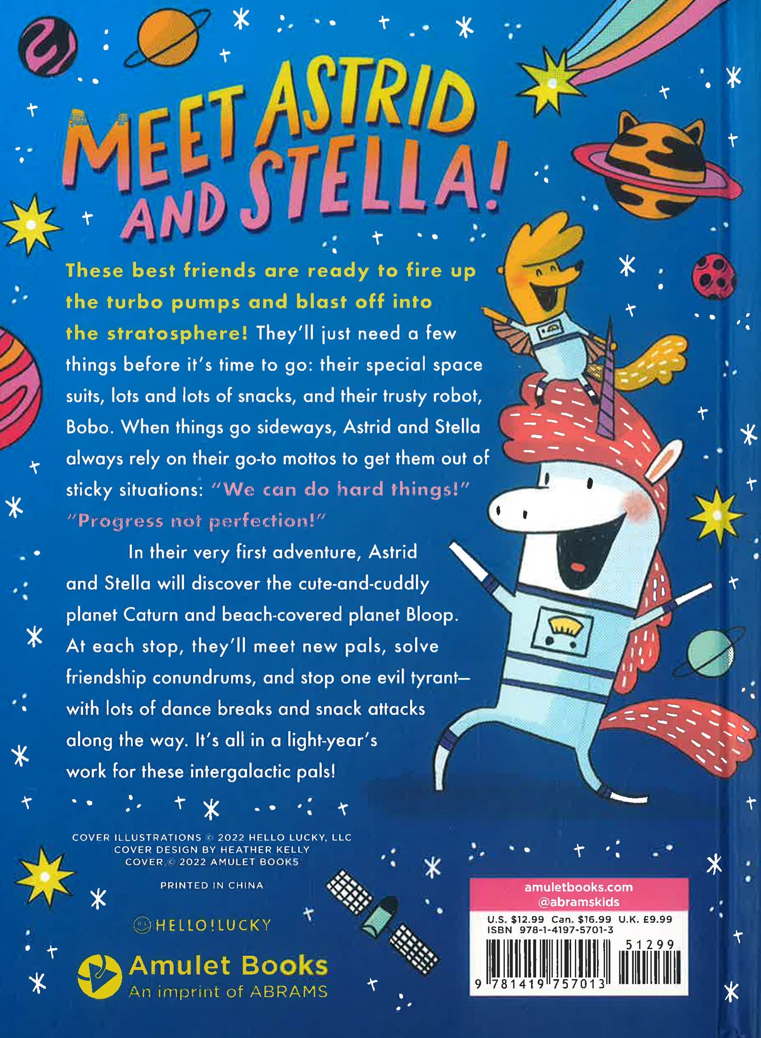 Meet Astrid and Stella! These best friends are ready to fire up the turbo blasters and take off into the stratosphere! They’ll just need a few things before it’s time to go: their special space suits, lots and lots of snacks, and their trusty robot, Bobo. When things go sideways, Astrid and Stella always rely on their go-to mottos to get them out of sticky situations: “We can do hard things!” and “Progress not perfection!”