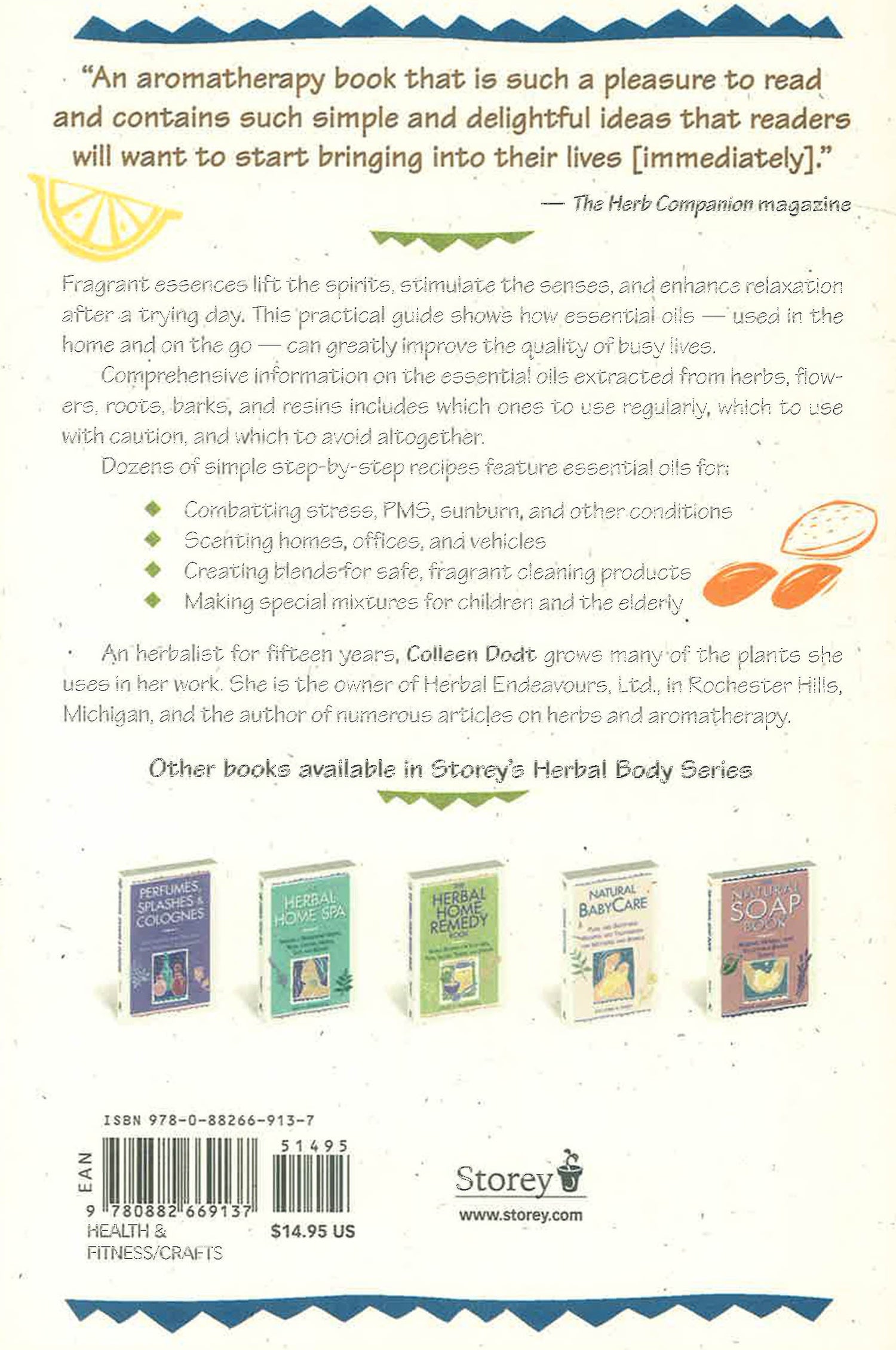 Discover the fragrant world of essential oils. Herbalist Colleen K. Dodt profiles the healing and cleaning powers of dozens of oils extracted from herbs, flowers, roots, barks, and resins. This comprehensive guide includes recipes for natural cleaning products, lotions, and ointments that will keep you feeling happy and smelling great. Fill your days with stimulating scents as you learn to use essential oils to wash your dishes, soothe sunburns, combat stress, and improve the quality of your life.