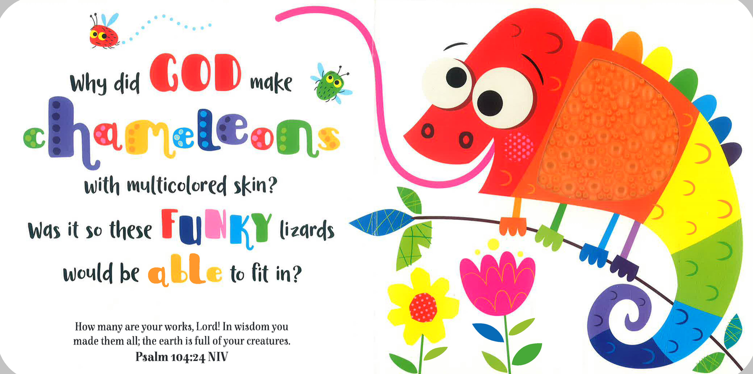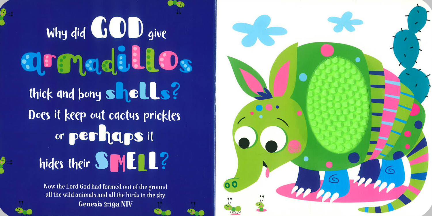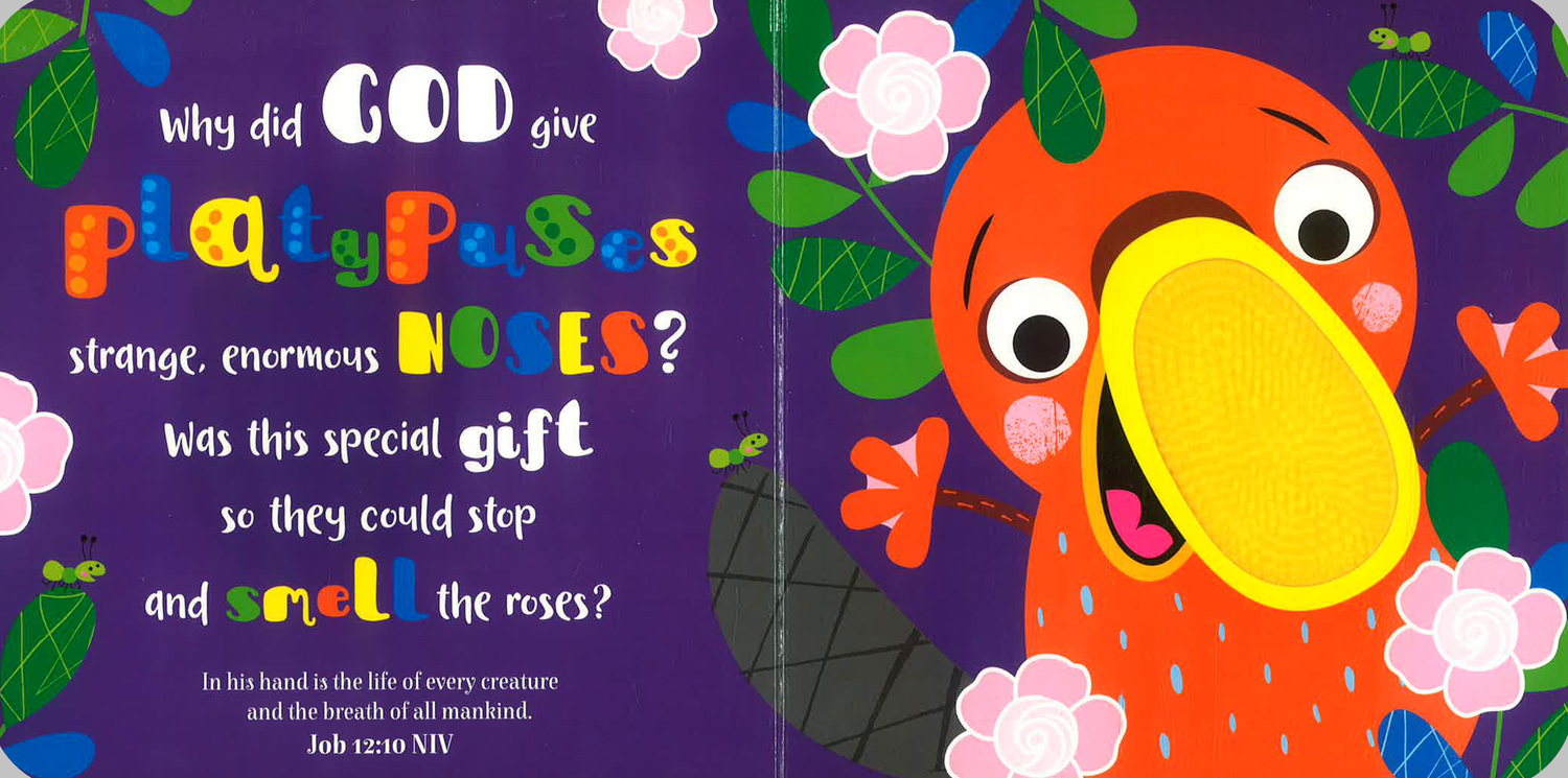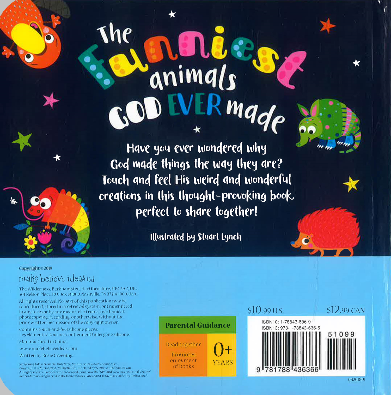 This hilarious touch-and-feel book is a light-hearted introduction to some of God's more unusual creations. Children will love reading the funny rhymes that introduce each creature. Innovative silicone touches feature throughout the book, with a different texture for children to explore on every spread.