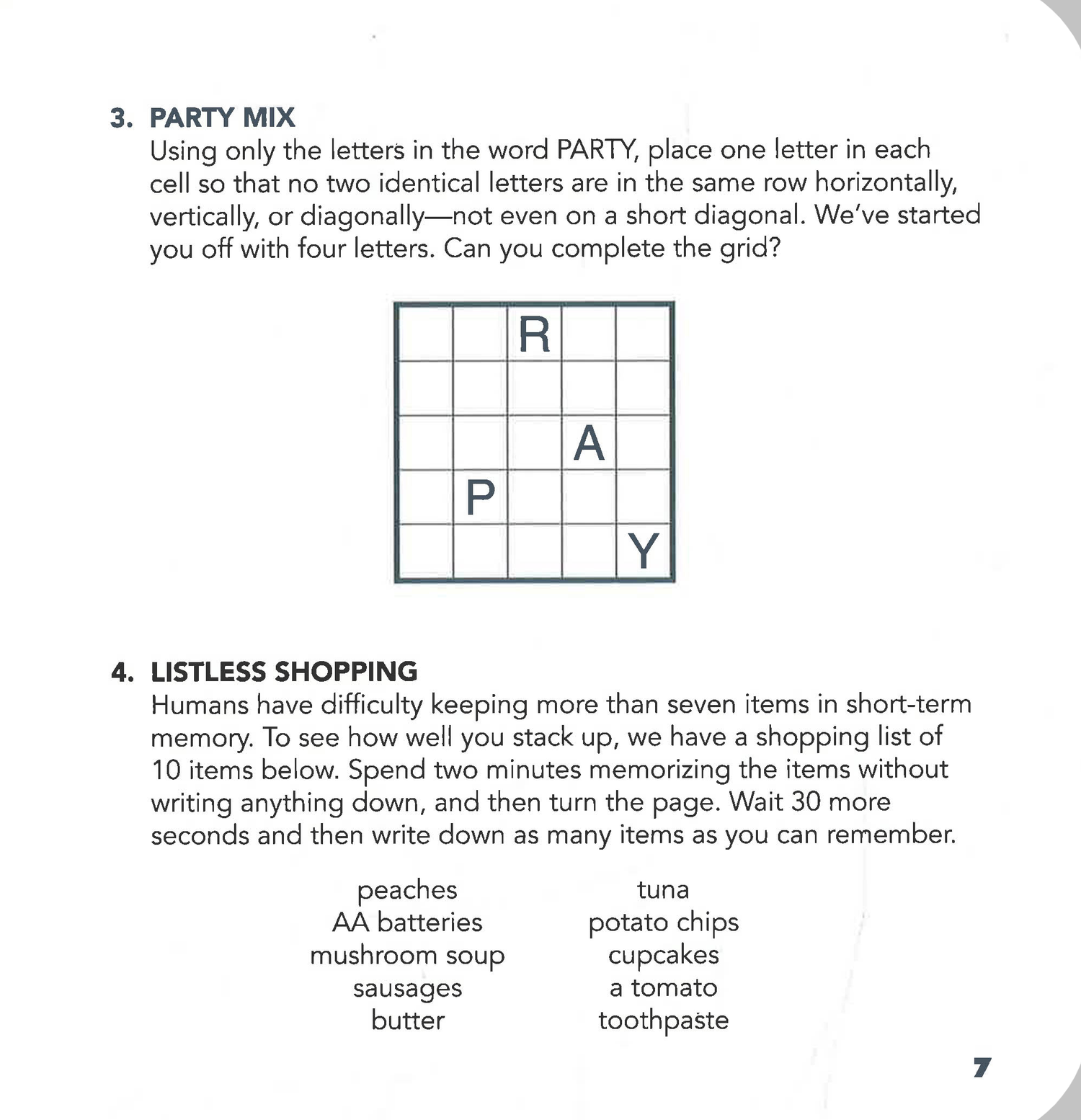 Research has shown that a great way to keep your memory and cognitive skills at their best is to learn challenging new things that require you to think. This puzzle book is perfect for doing just that, since it features a wide variety of IQ-type brainteasers to keep solvers on their toes: different types of word games, memory tests, logic puzzles, and math problems, with something new on every page. It's a refreshingly fun mental workout!