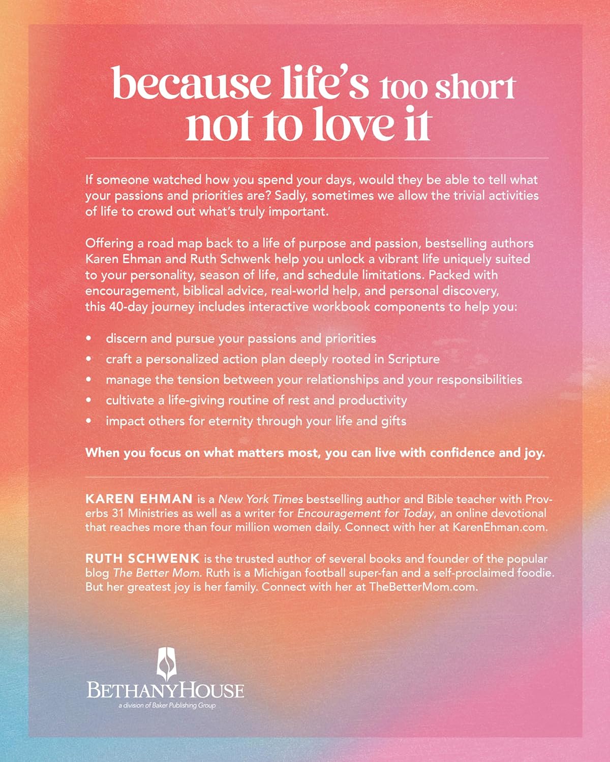 Unlock a vibrant life uniquely suited to your personality, season of life, and schedule limitations with bestselling authors Karen Ehman and Ruth Schwenk. Packed with encouragement, biblical advice, real-world help, and personal discovery, this 40-day journey includes interactive components to help you find your roadmap back to a life of purpose and passion.