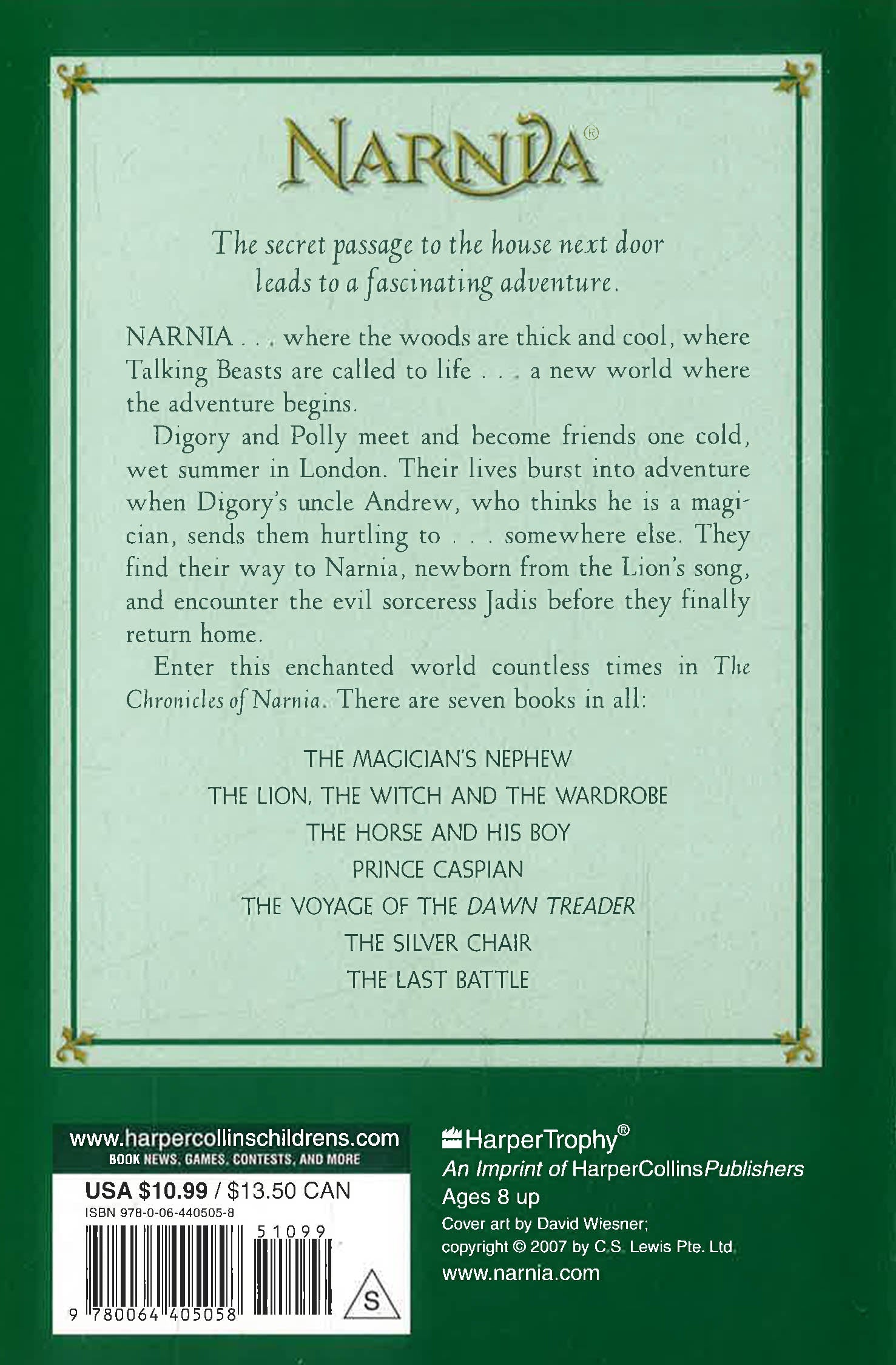 Witness the creation of a magical land in The Magician's Nephew, the first title in C. S. Lewis's classic fantasy series, which has captivated readers of all ages for over sixty years. This paperback features cover art by three-time Caldecott Medal-winning illustrator David Wiesner and black-and-white interior art by the series' original illustrator, Pauline Baynes.