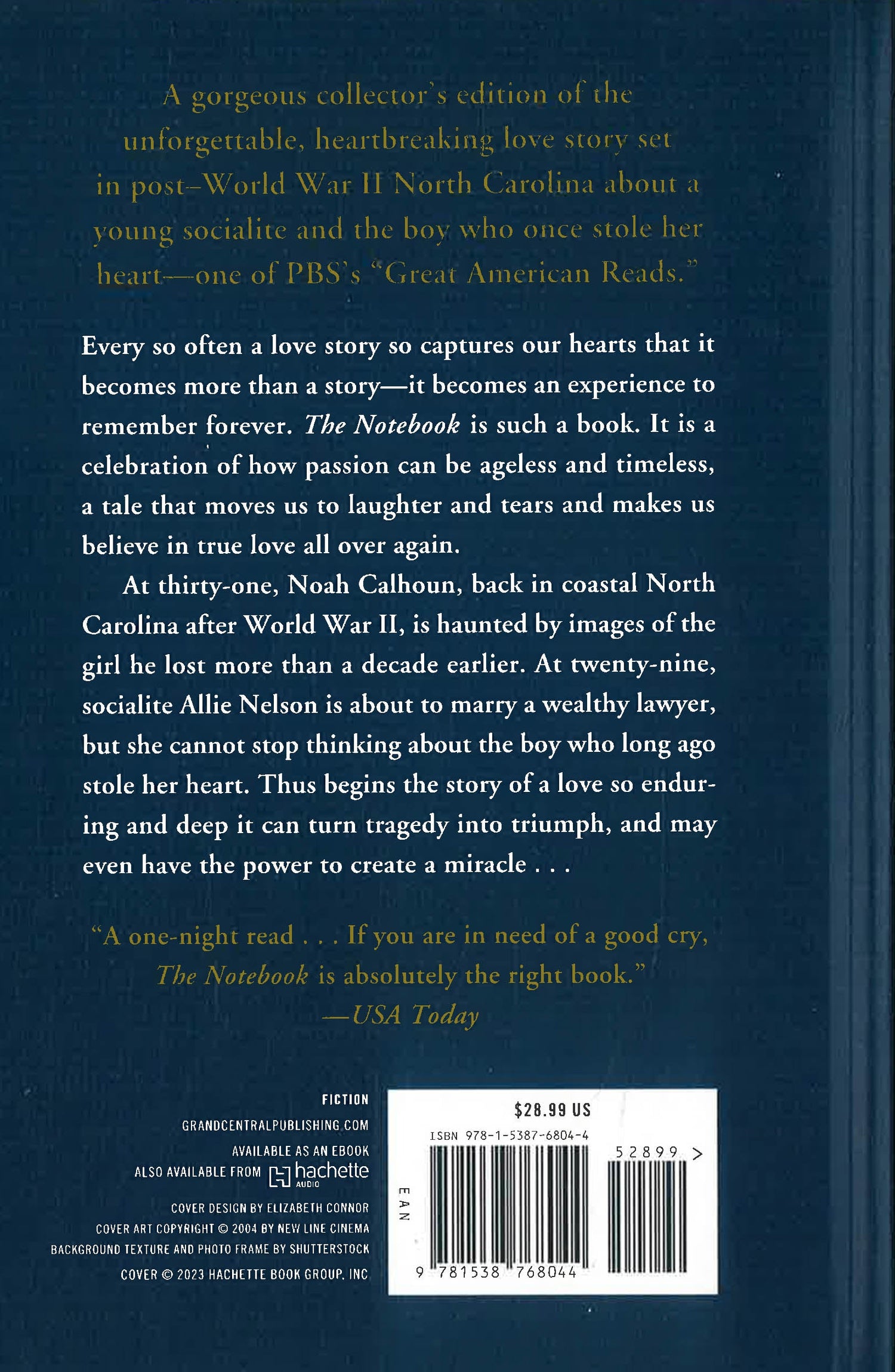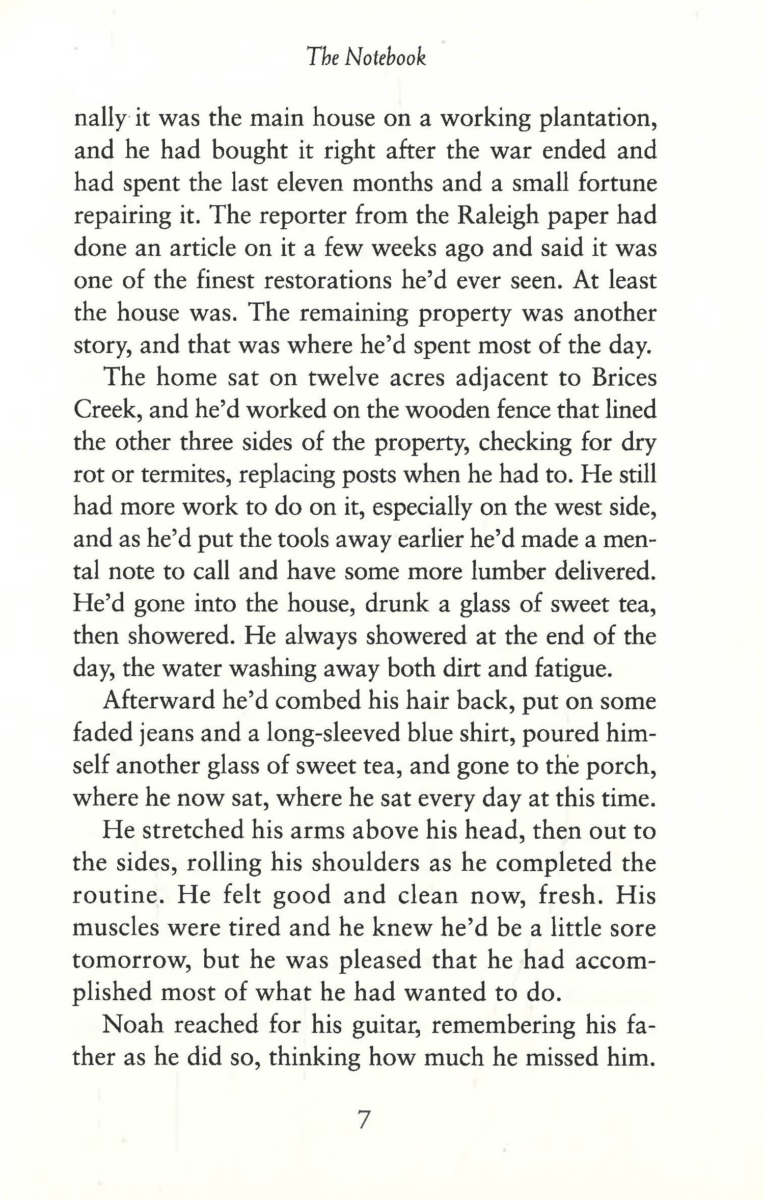 Every so often a love story so captures our hearts that it becomes more than a story -- it becomes an experience to remember forever. The Notebook is such a book. It is a celebration of how passion can be ageless and timeless, a tale that moves us to laughter and tears and makes us believe in true love all over again . . . At thirty-one, Noah Calhoun, back in coastal North Carolina after World War II, is haunted by images of the girl he lost more than a decade earlier. At twenty-nine, socialite Allie Nelson is about to marry a wealthy lawyer, but she cannot stop thinking about the boy who long ago stole her heart. Thus begins the story of a love so enduring and deep it can turn tragedy into triumph, and may even have the power to create a miracle . . .