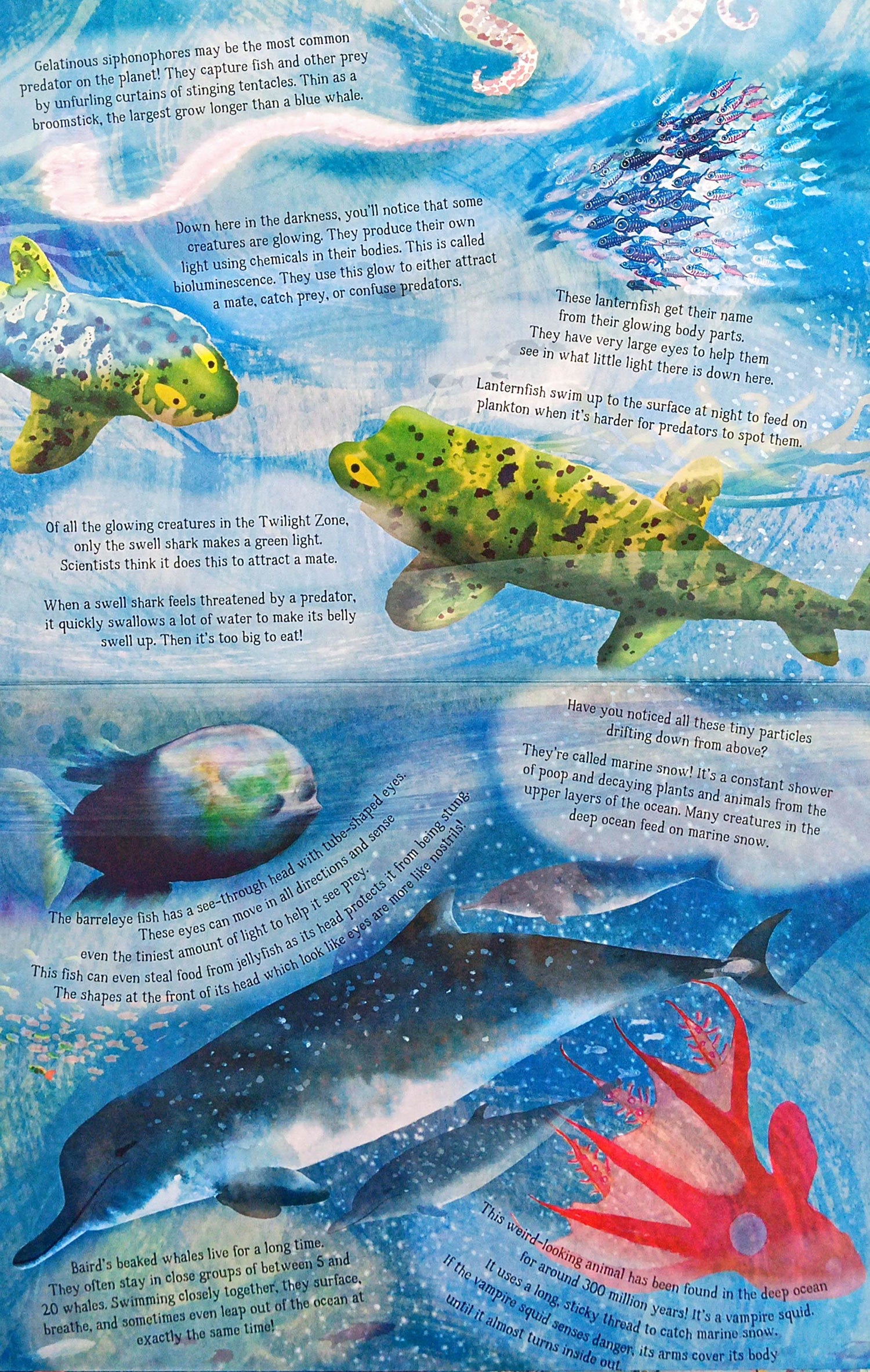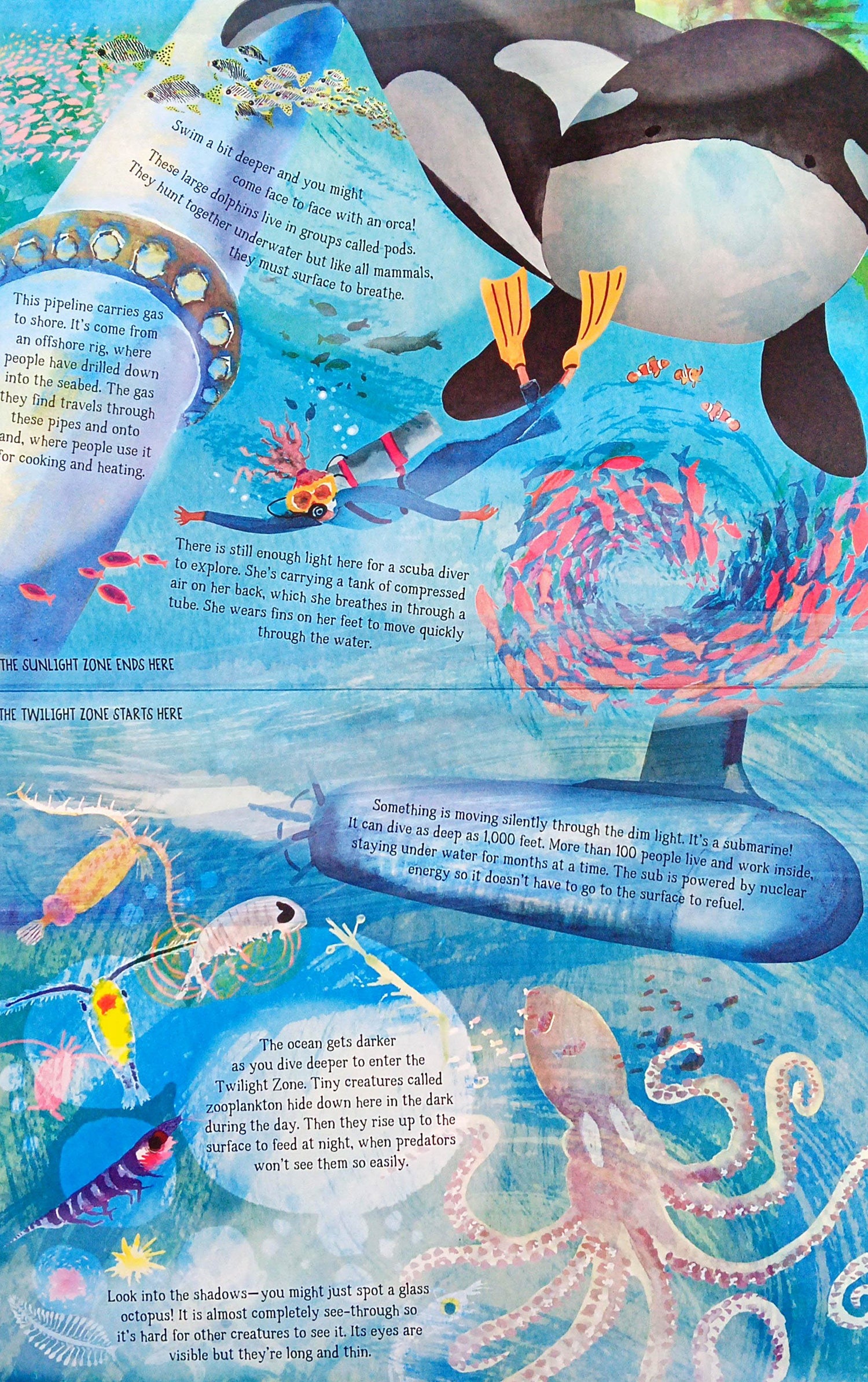 From the Look Closer series, this richly illustrated concertina book takes you on a journey through the deep dark waters, all the way down to the seabed, before floating back up to the surface.