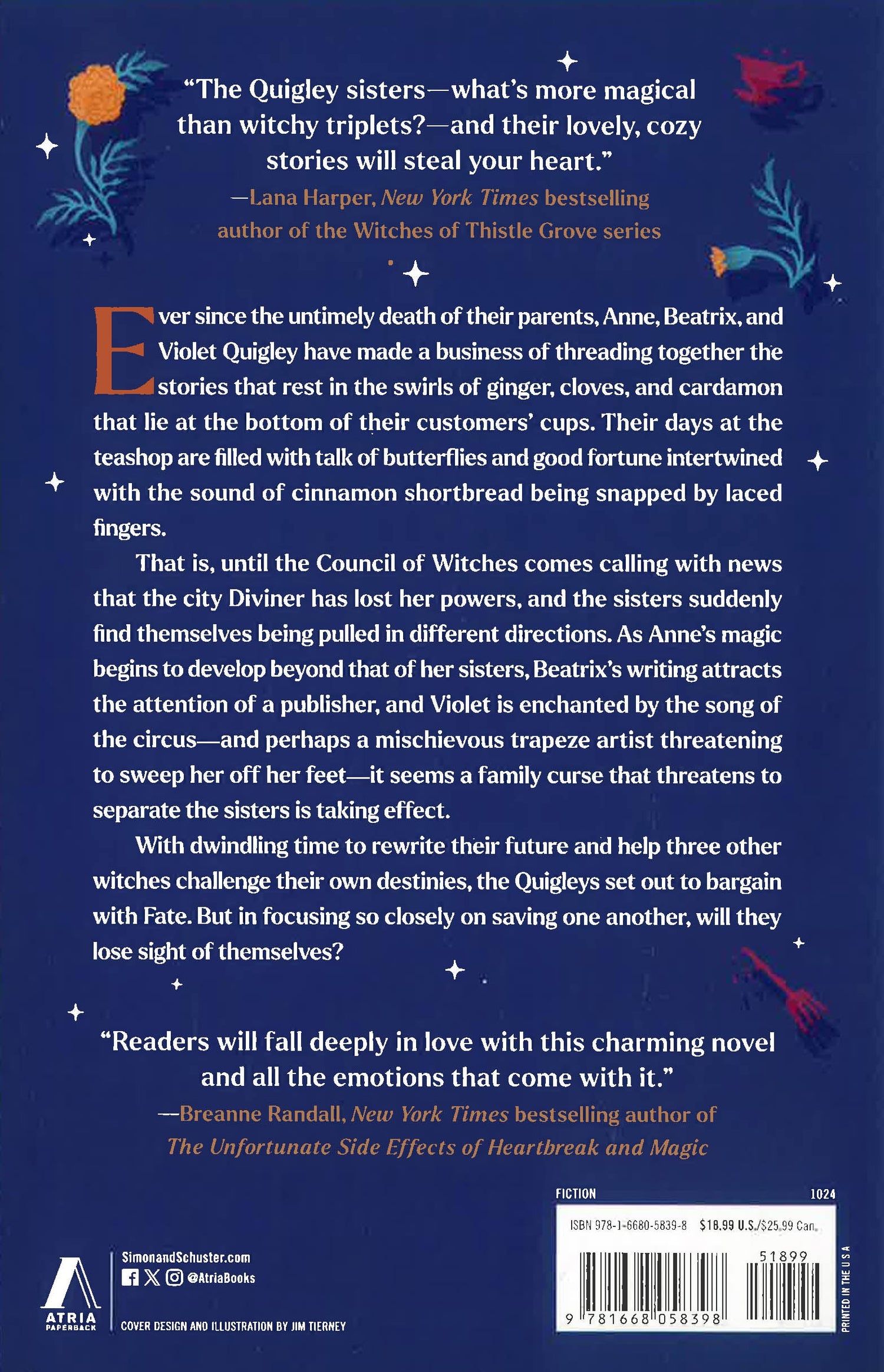 Ever since the untimely death of their parents, Anne, Beatrix, and Violet Quigley have made a business of threading together the stories that rest in the swirls of ginger, cloves, and cardamon that lie at the bottom of their customers’ cups. Their days at the teashop are filled with talk of butterflies and good fortune intertwined with the sound of cinnamon shortbread being snapped by laced fingers.