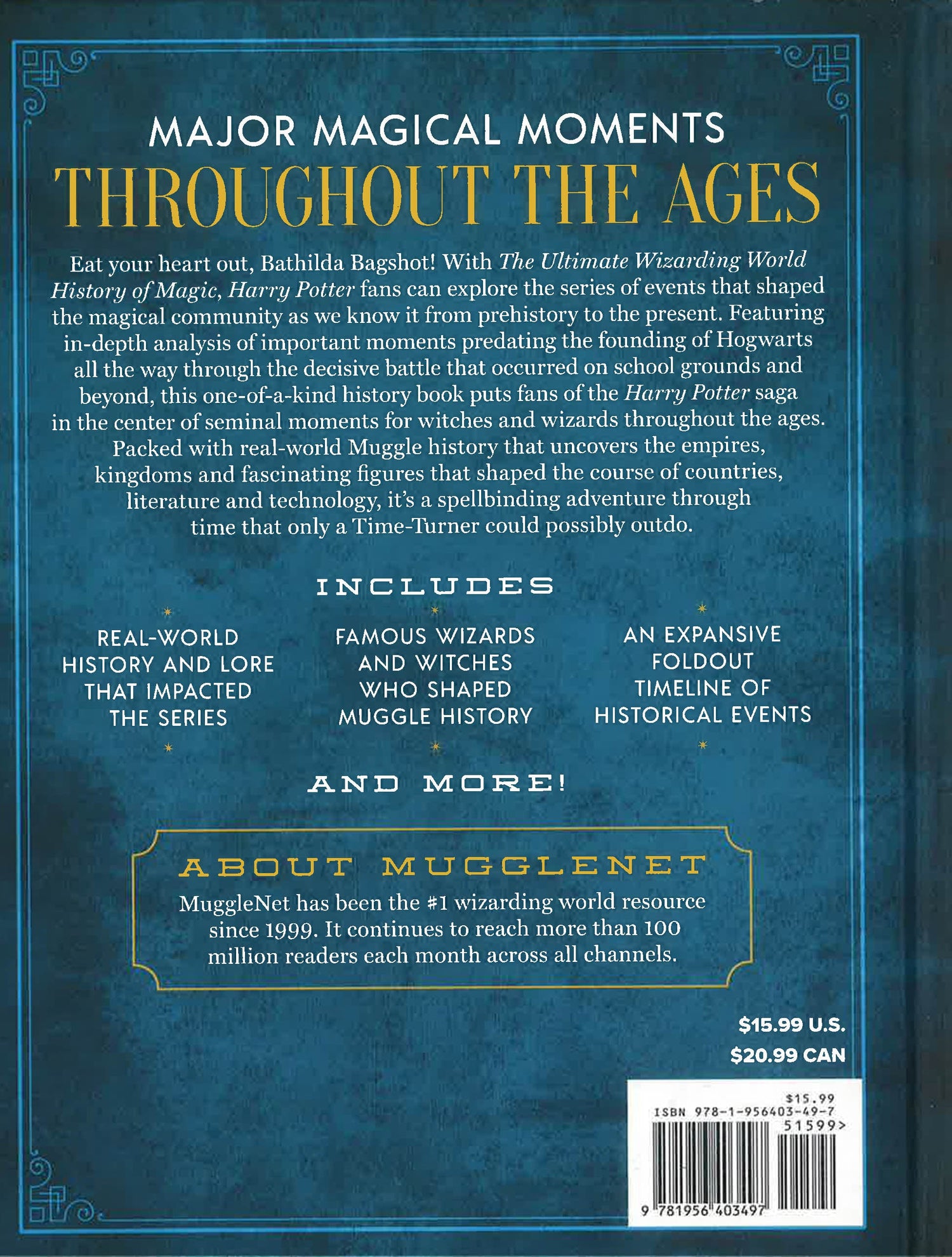 Harry Potter's adventures are built upon a rich tapestry of historical events dating back as far as the first century, during which an ancient Greek wizard known only as Herpo the Foul created the first usable Horcrux. It was this successful venture nearly two millennia ago that enabled the evil wizard Voldemort to create one Horcrux for each piece of his splintered soul. In The Ultimate Wizarding World History of Magic, the editors of MuggleNet document all of the significant historical events the shaped the wizarding world, from Herpo's first breakthrough through the final adventures of Harry Potter and his friends. Readers will learn about the founding of Hogwarts, the beginnings of Quidditch and its rules, the creation of the sword of Gryffindor and much more. It's the only book of its kind to delve so deep into the history and mysteries of the world of witches and wizards. Topics covered include: · The creation of the Chamber of Secrets · The beginnings of the Triwizard Tournament · Incidents related to Muggle 'magic,' such as the Salem witch trials, and their impact upon the wizarding world · The founding of Gringotts Bank · Important historical figures, including those shared with the Muggle world such as Merlin · The birth of Albus Dumbledore · World War I and its impact upon the wizarding world · The Battle of Hogwarts · The installment of Harry Potter as Head of the Auror Department · And much more Informed by dozens of different official sources, and supplemented with family trees and informative timelines, The Ultimate Wizarding World History of Magic provides all the information fans could want to fill in the holes of the Harry Potter narrative, while shining a light on everything that makes the wizarding world feel so complex, deep and infused with a sense of mythic grandeur.