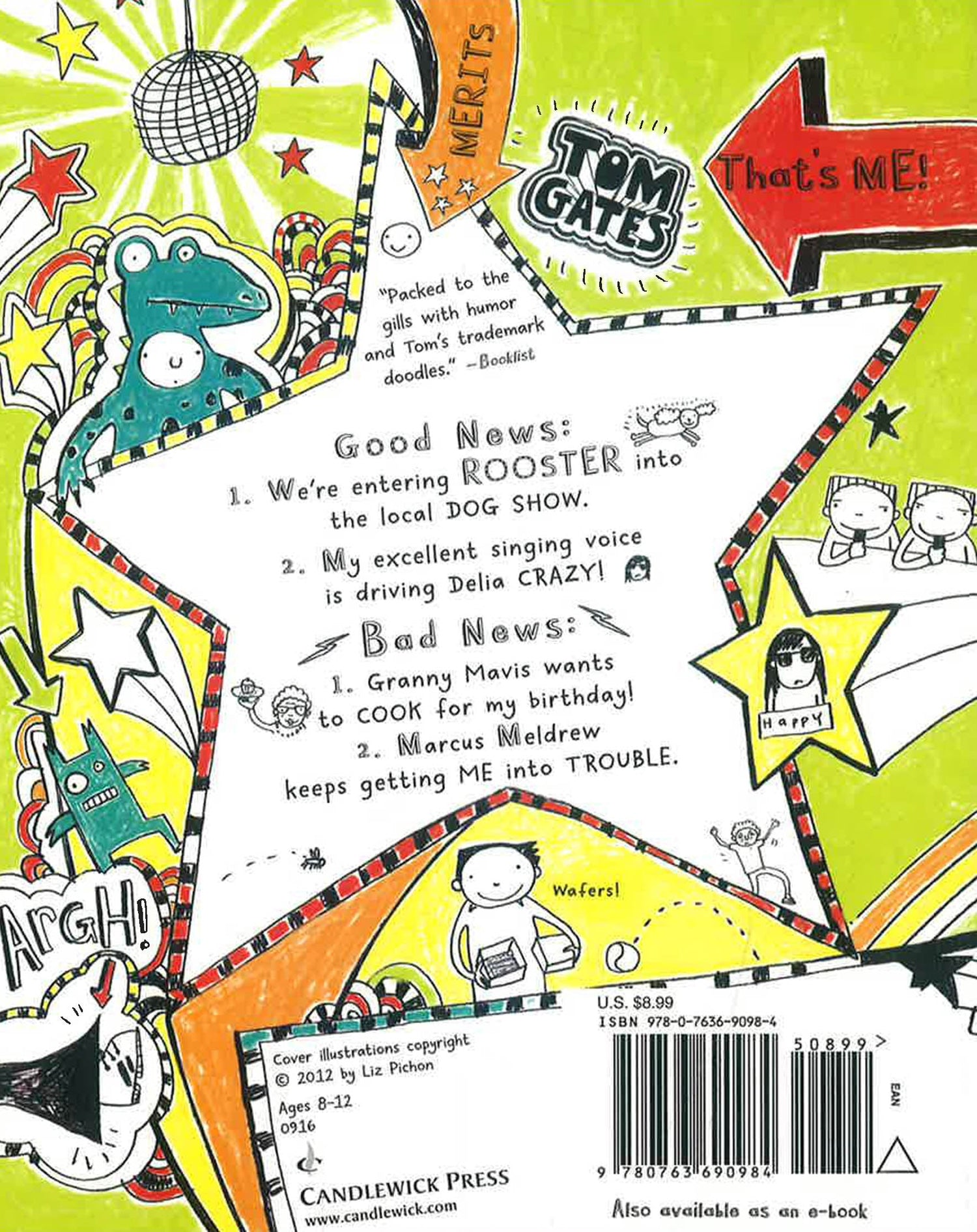 Things are looking up for Tom Gates. The school dance is coming, and his birthday, too! What could possibly put him in a bad mood? Well, the words math lesson, for one thing. And that annoying twit Marcus Meldrew at school. And Granny Mavis threatening to bake Tom’s birthday cake (carrots!). Worst of all, can it be true that Tom’s dad has volunteered to deejay the school dance wearing his wacky dinosaur costume?