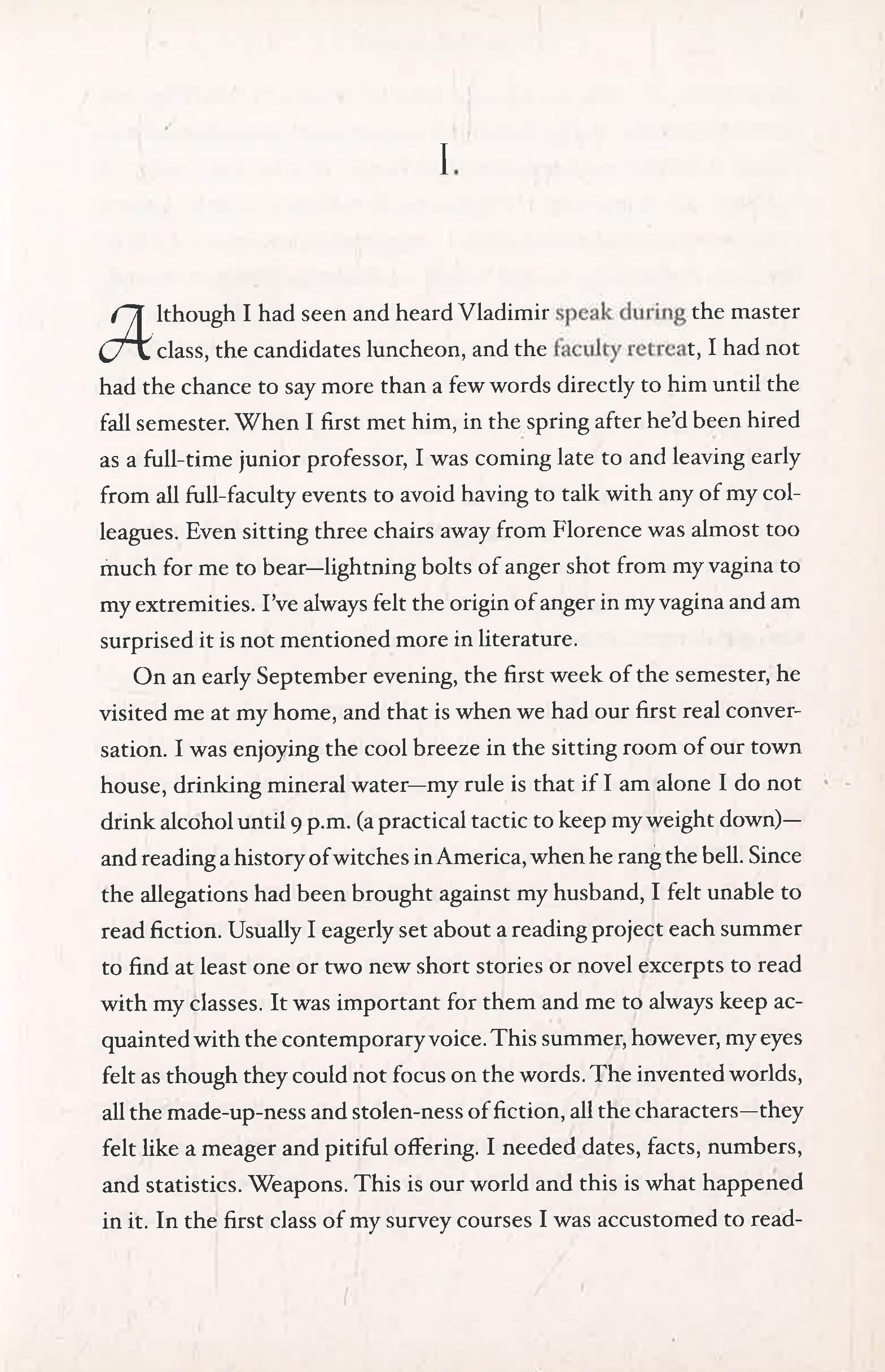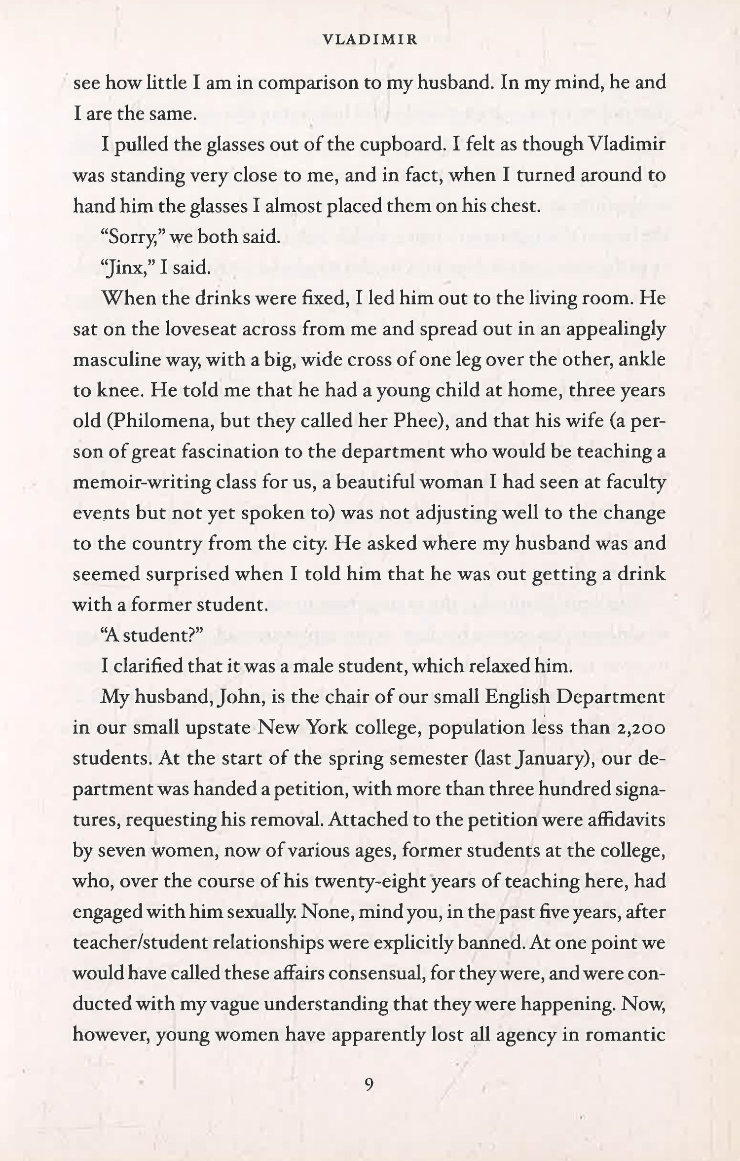 “When I was a child, I loved old men, and I could tell that they also loved me.” And so we are introduced to our narrator who’s “a work of art in herself” (The Washington Post): a popular English professor whose charismatic husband at the same small liberal arts college is under investigation for his inappropriate relationships with his former students. The couple have long had a mutual understanding when it comes to their extra-marital pursuits, but with these new allegations, life has become far less comfortable for them both. And when our narrator becomes increasingly infatuated with Vladimir—a celebrated, married young novelist who’s just arrived on campus—their tinder box world comes dangerously close to exploding.