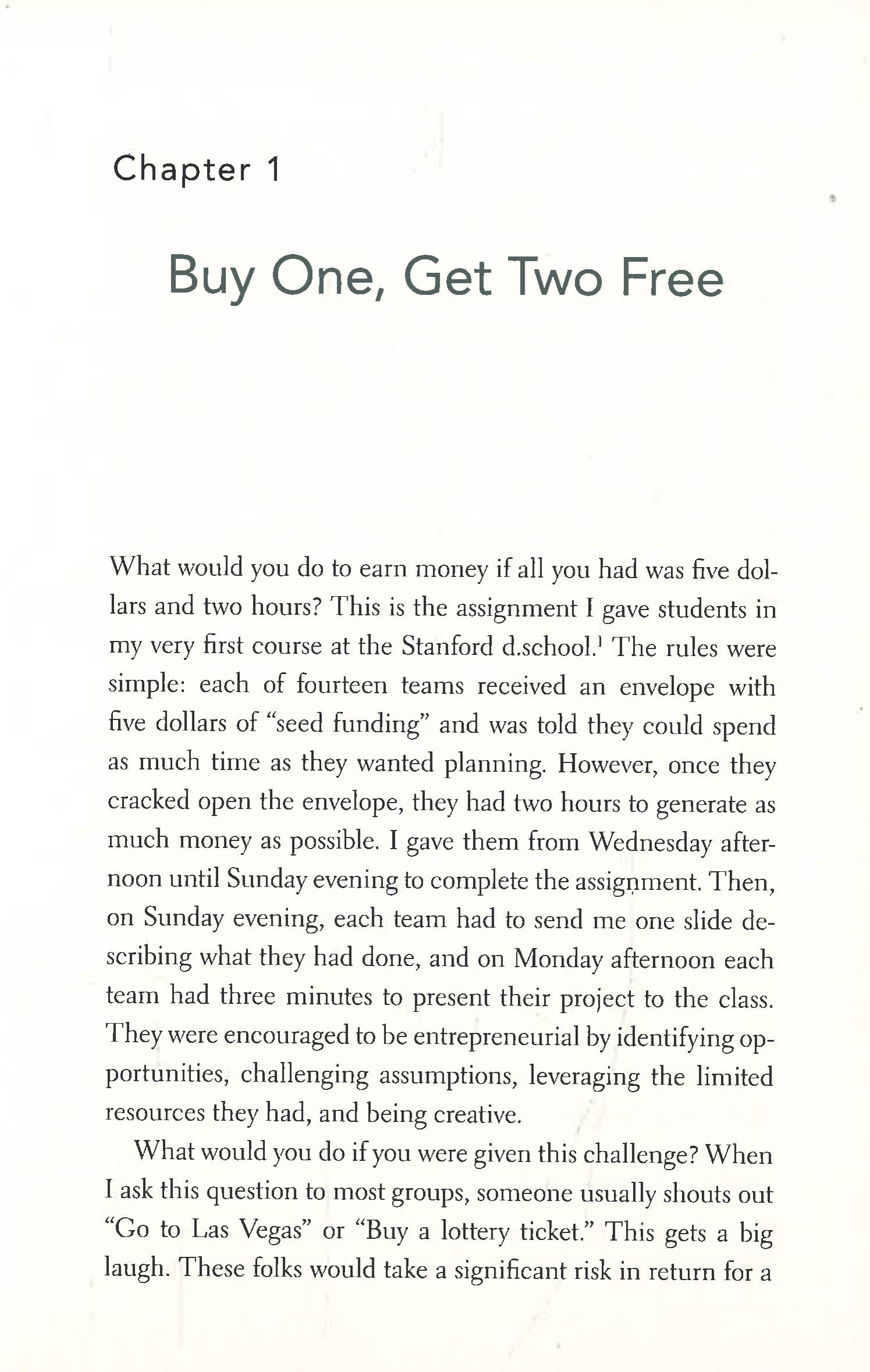 These pages are filled with captivating examples, from the classroom to the boardroom, of individuals defying expectations, challenging assumptions, and achieving unprecedented success. Seelig throws out the old rules and provides a new model for reaching our potential. We discover how to have a healthy disregard for the impossible; how to recover from failure; and how most problems are remarkable opportunities in disguise.