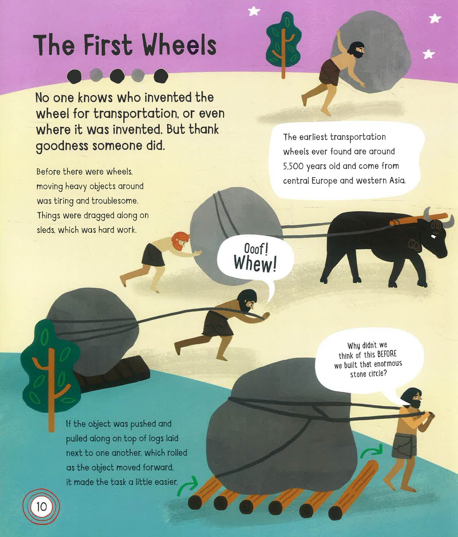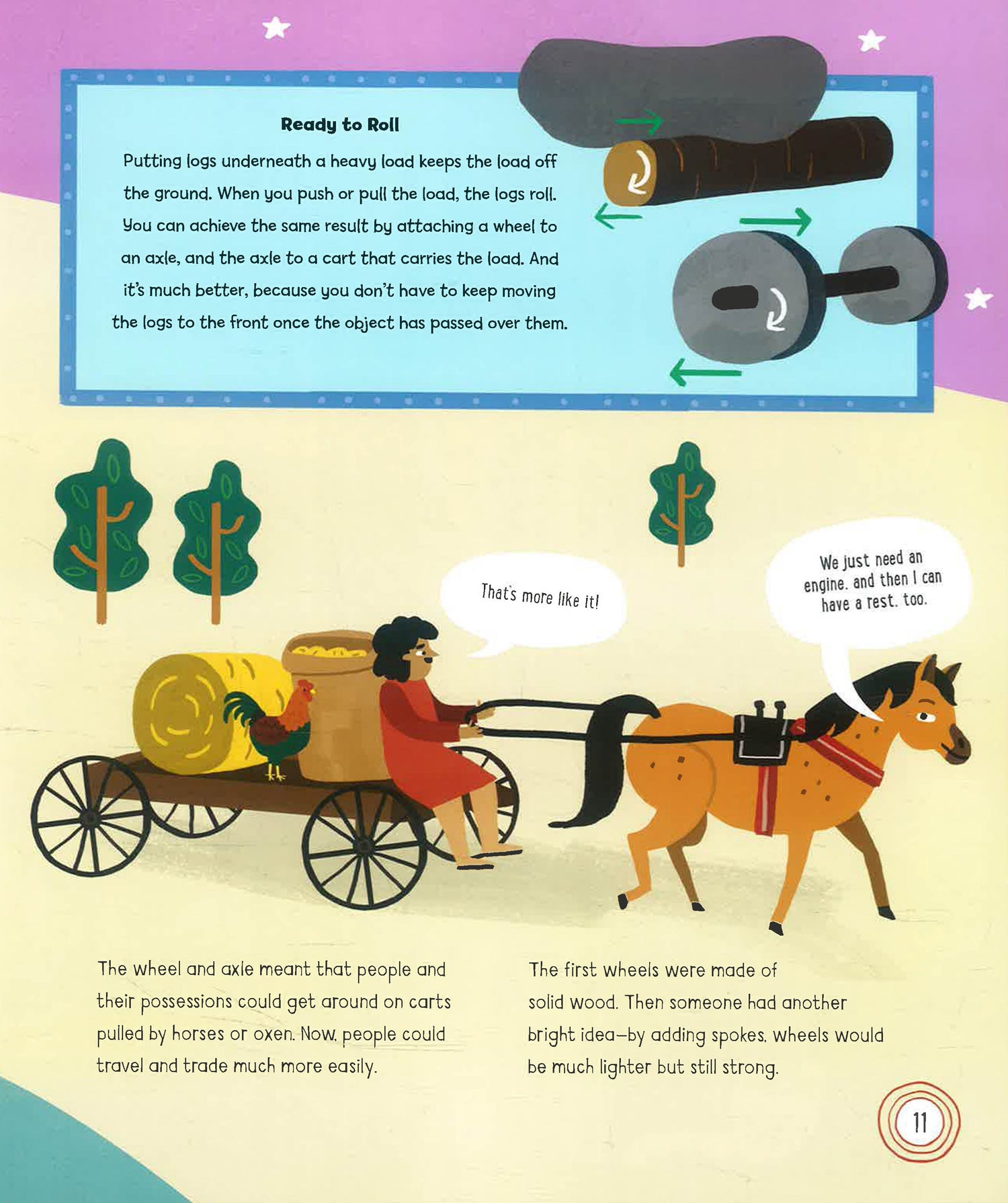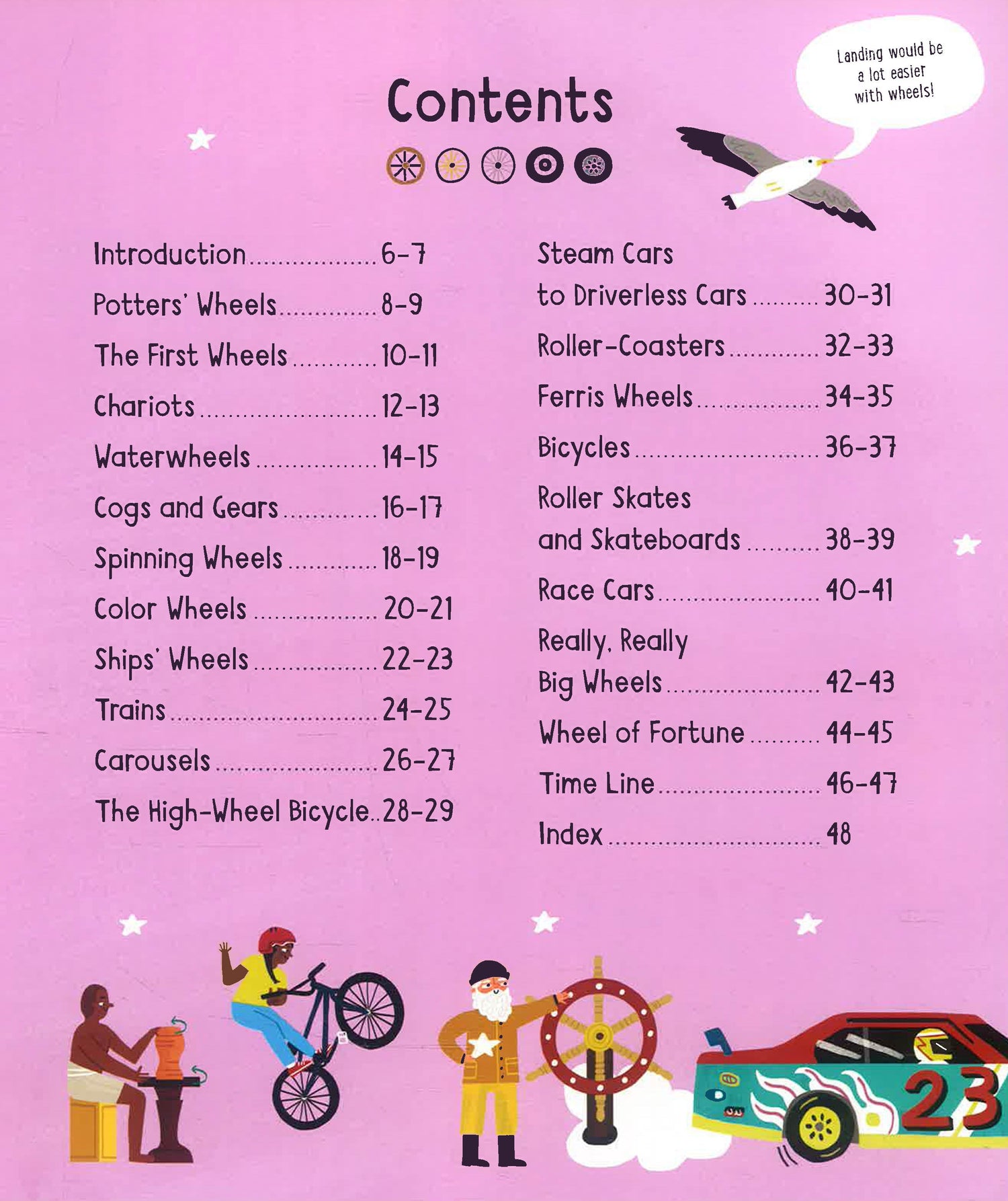Discover how wheels make the world go round! Now available in paperback, this fact-packed book by Tracey Turner takes young readers on a colorful journey through the subject of wheels of all kinds, from Roman chariots to driverless cars, via roller coasters, cogs and gears, monster trucks, and much more.