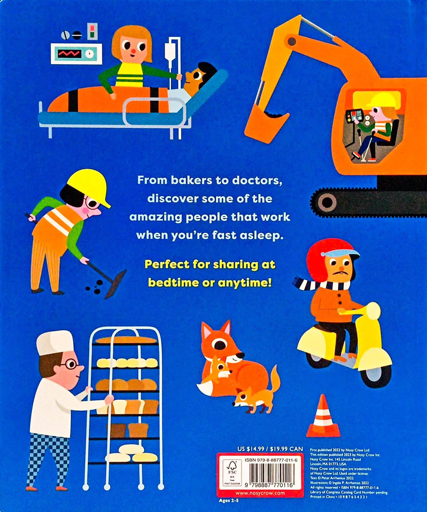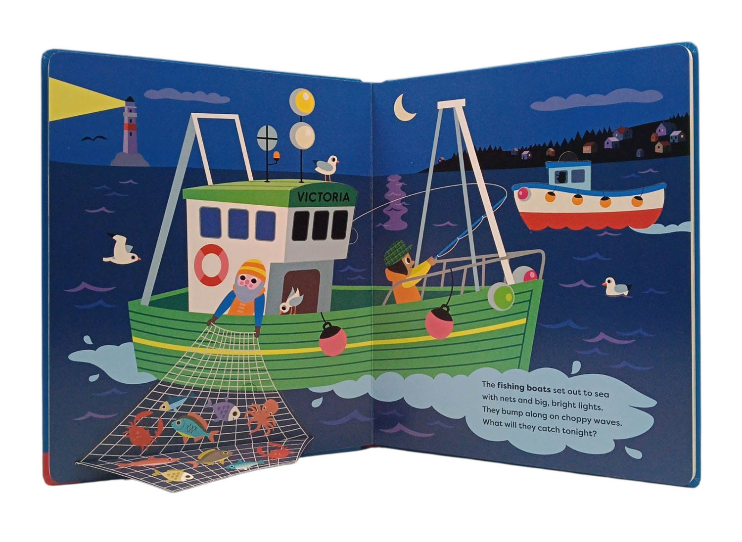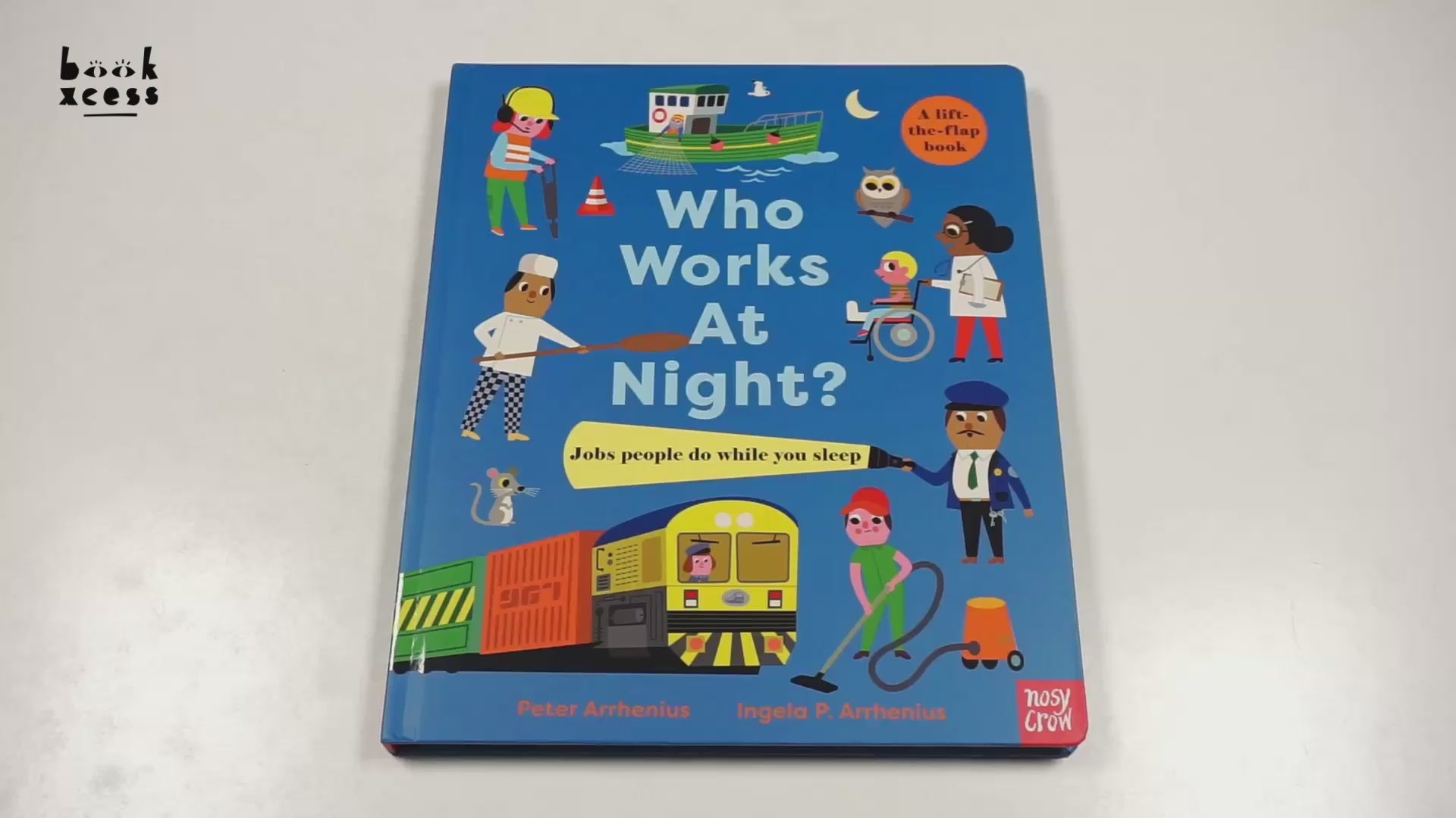 There are all kinds of people that work during the night-time, from bakers to doctors, train drivers to road workers, and out at sea or in an art gallery. Peek inside the oven at the bakery, find out if the fishing boats have caught any fish, and open the doors into a busy hospital. Learn more about the world at night with this fun lift-the-flap book that's packed with details and perfect for sharing at bedtime.