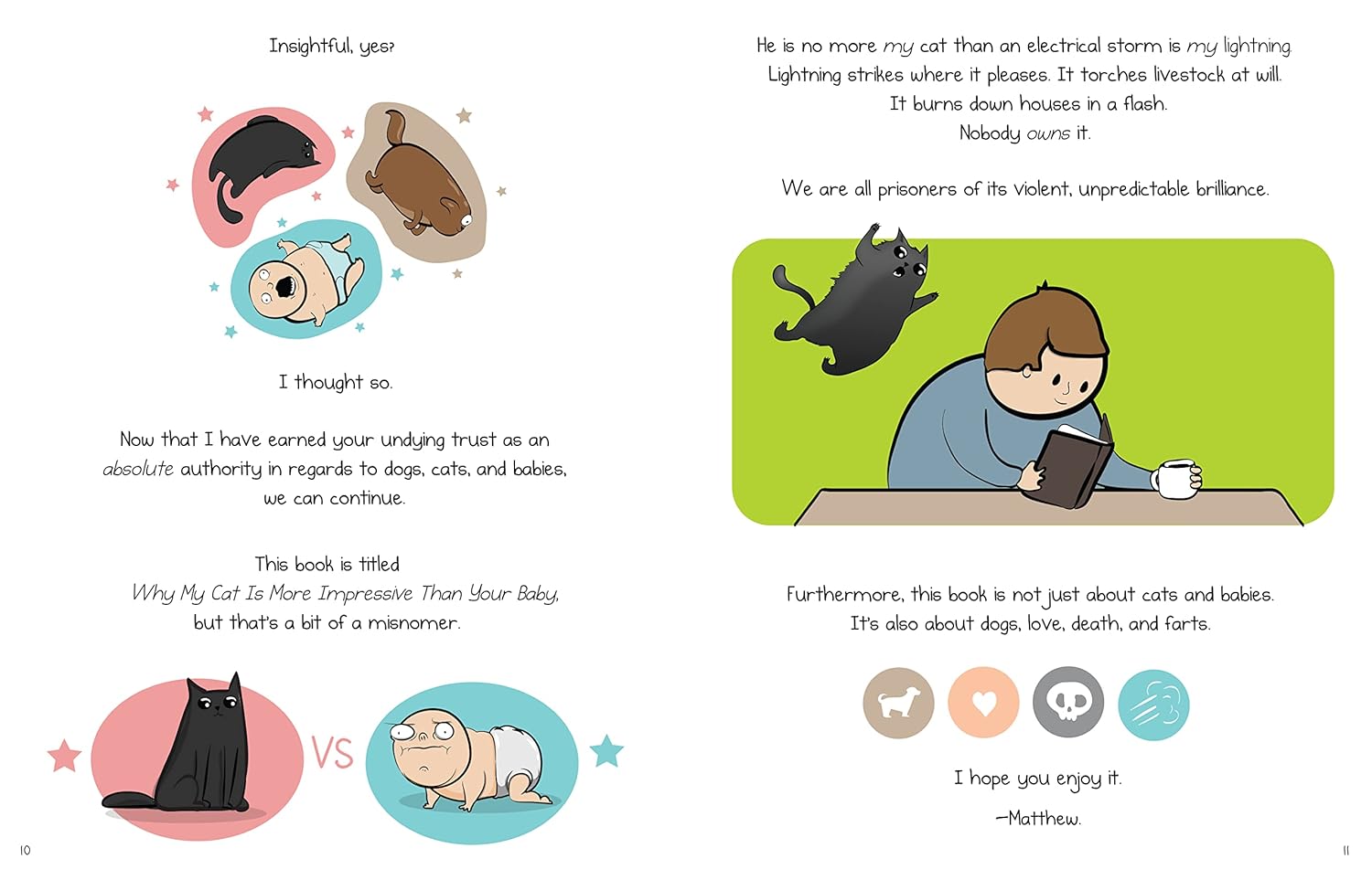Why My Cat Is More Impressive Than Your Baby is chockfull of comics about cats, babies, dogs, lasers, selfies, and pigeons! This book contains a vast wealth of never-before-seen comics, including informative guides, such as: