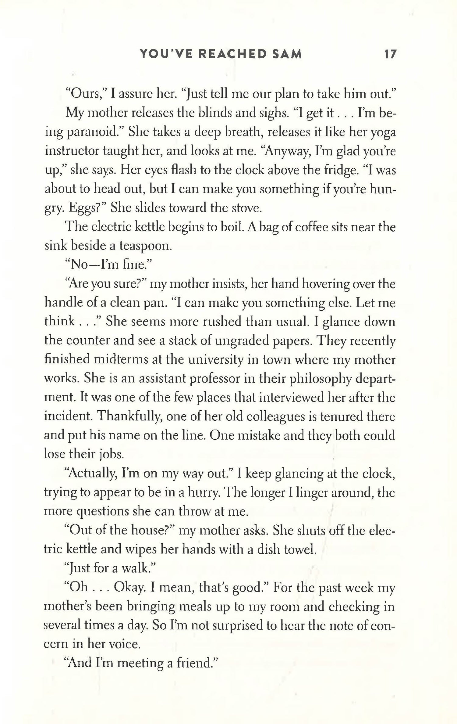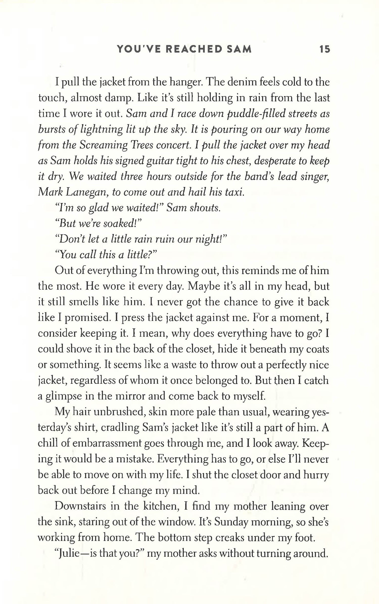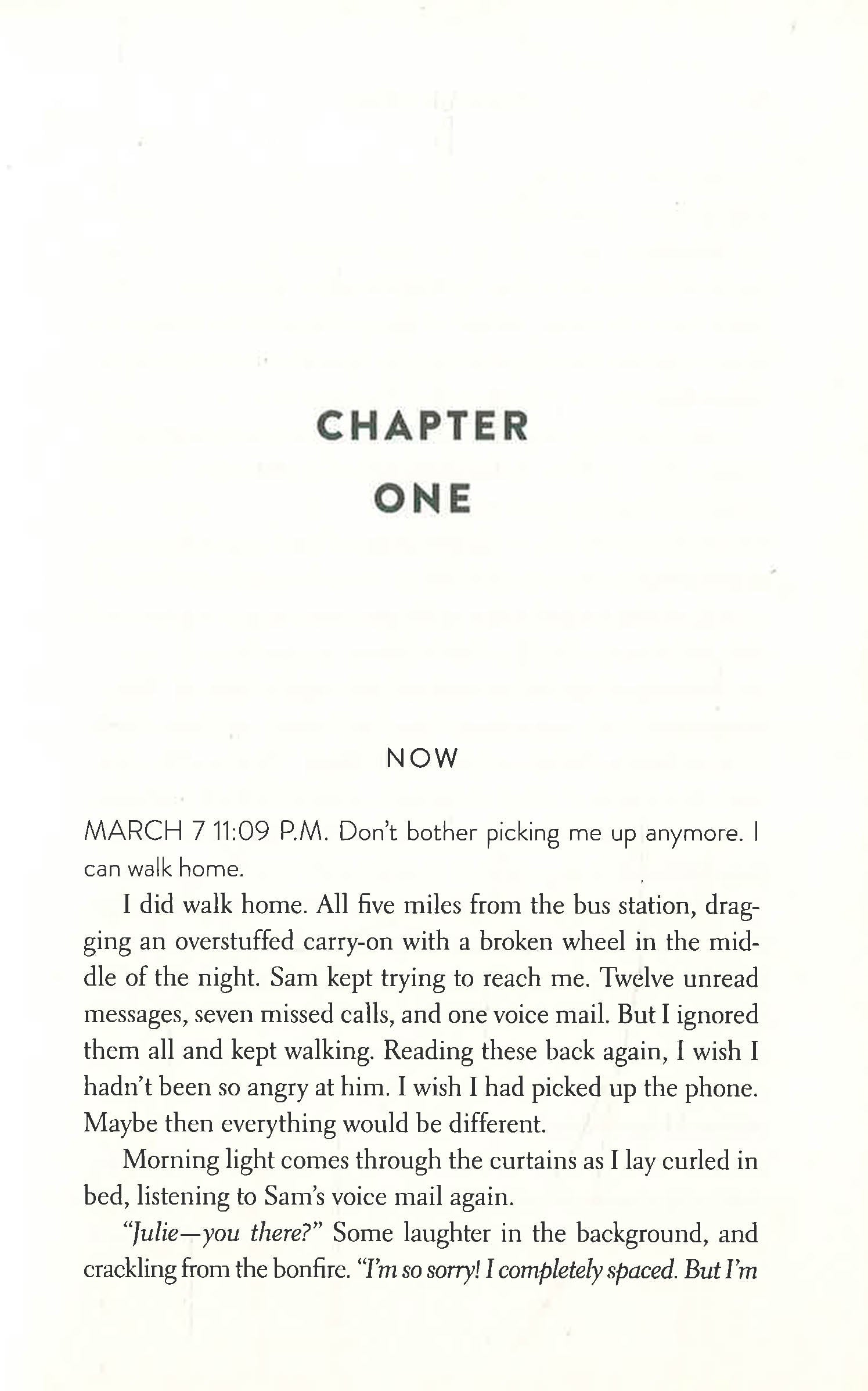 Heartbroken, Julie skips his funeral, throws out his belongings, and tries everything to forget him. But a message Sam left behind in her yearbook forces memories to return. Desperate to hear him one more time, Julie calls Sam's cell phone just to listen to his voice mail recording. And Sam picks up the phone.