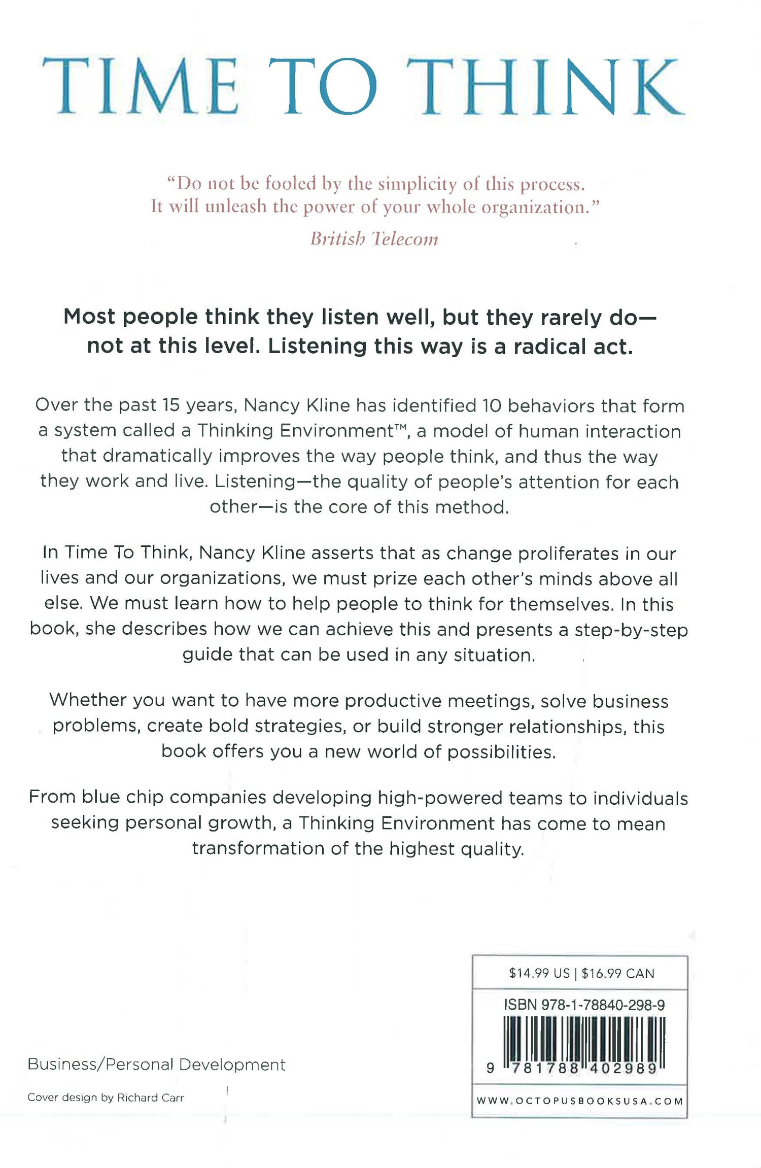 The power of effective listening is recognized as the essential tool of good management. In this book, Kline describes how we can achieve this, and presents a step-by-step guide that can be used in any situation. Whether you want to have more productive meetings, solve business problems or build stronger relationships, this book offers you a new world of possibilities.