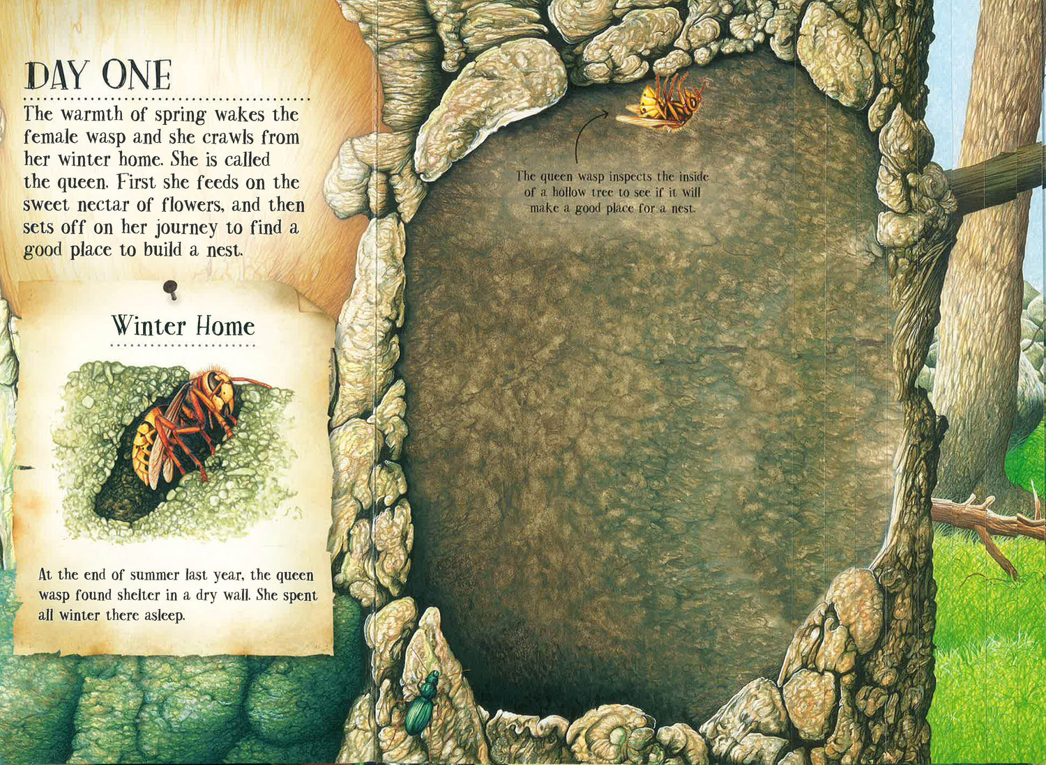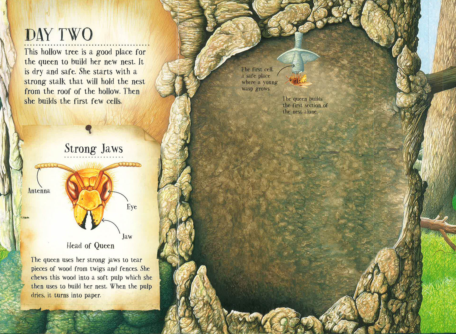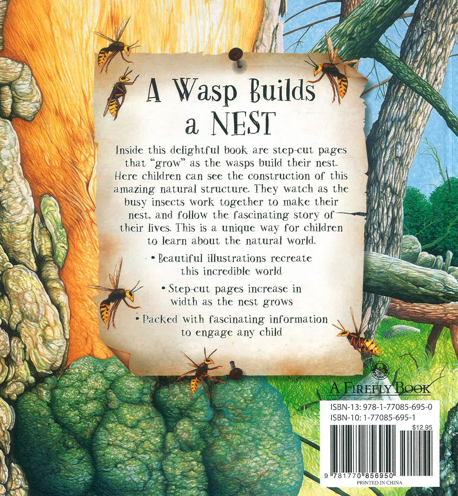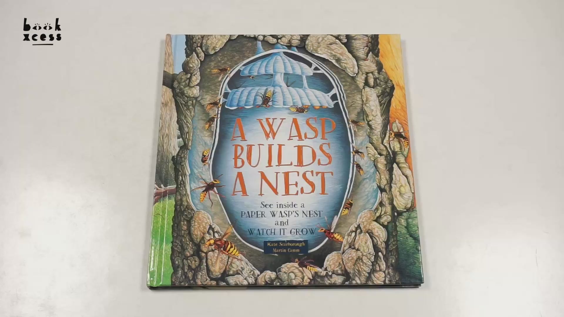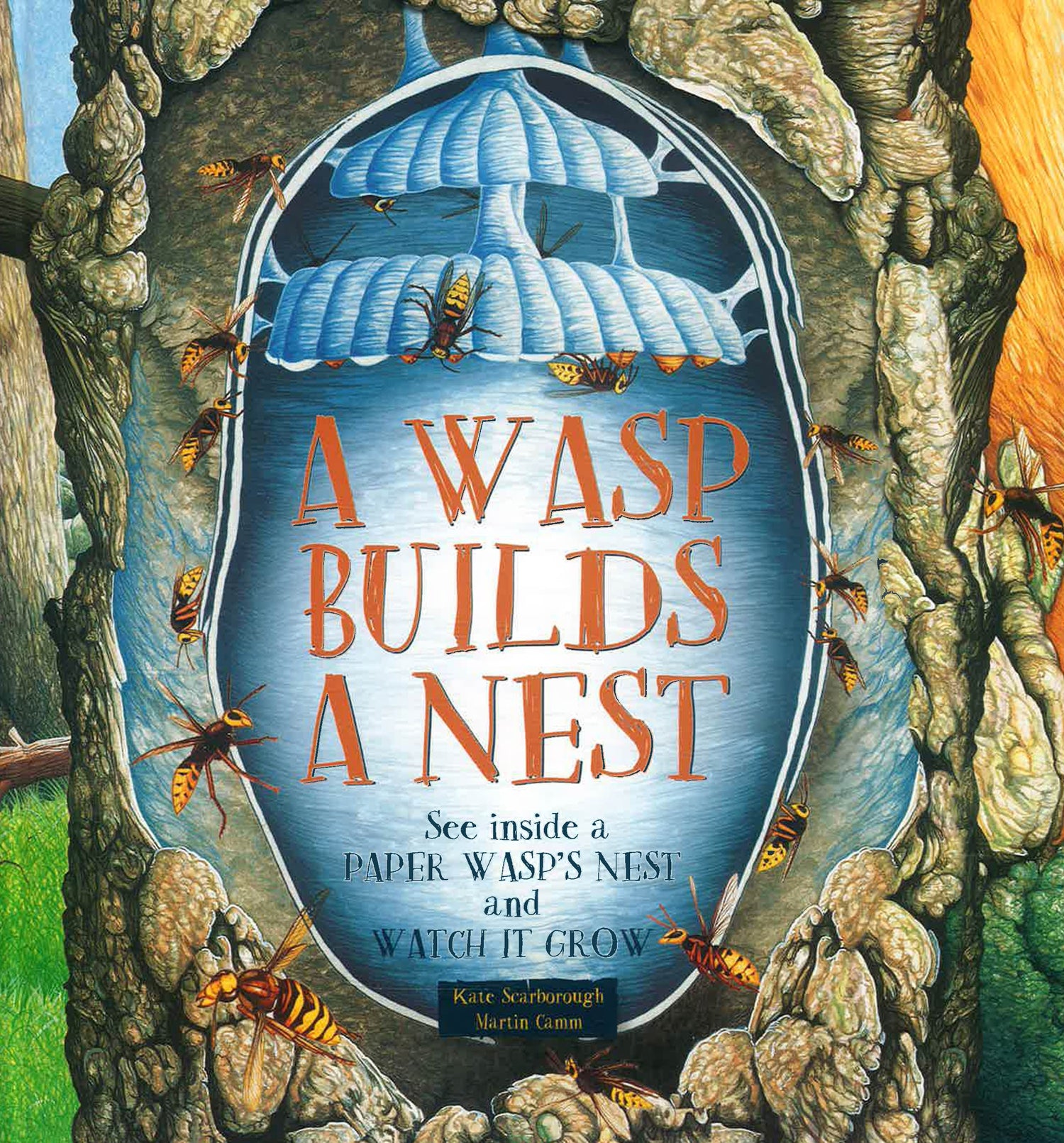 This elegantly illustrated book explains stage by stage in easy text how a wasp nest is built. It follows by days and weeks and shows how the queen's industrious workers create a sturdy, weatherproof home. Readers see the inside of the growing nest where the eggs turn into larvae and emerge 20 days later as juveniles. As the nest gets bigger and the story progresses, the book's pages become bigger too. Cross sections show the amazing construction of the nest and how the wasps live and work.