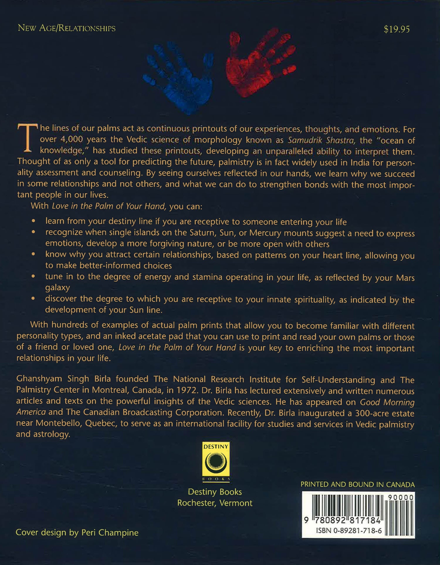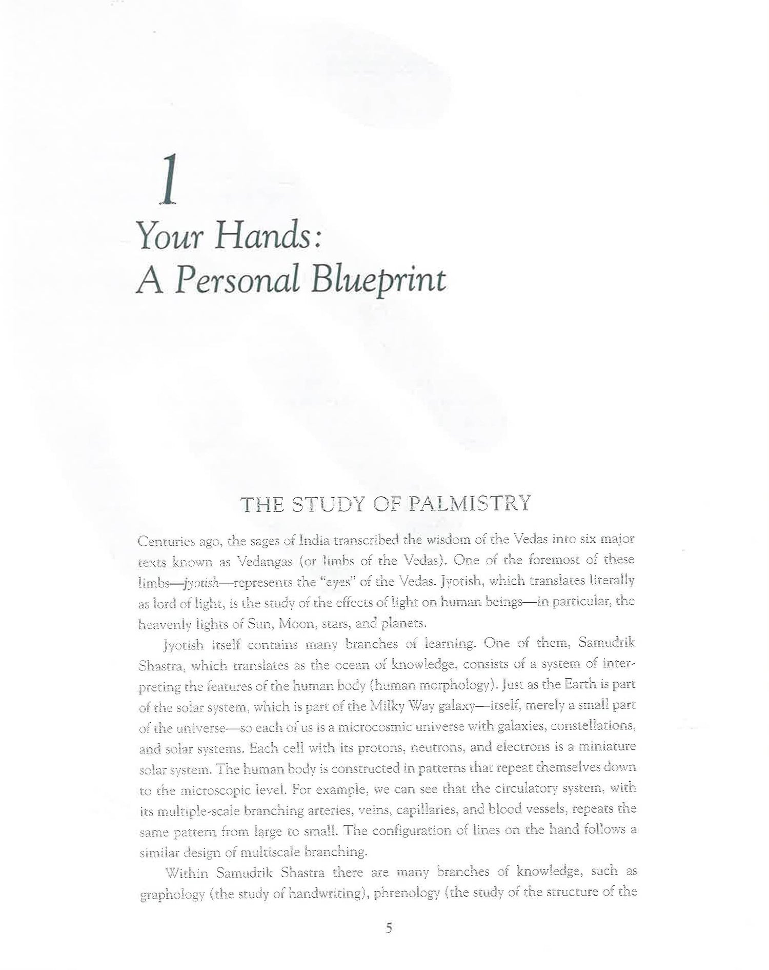 The lines of our palms are like continuous printouts of our experiences, thoughts, and emotions. For 4,500 years the Indian science of morphology known as Samudrik Shasta, the "ocean of knowledge," has studied these printouts, developing an unparalleled ability to interpret them. Though often thought of as only a tool for fortune-telling, palmistry is used in India for personality assessment and counseling. By seeing our own personalities as they are reflected in the unique signature of our palms, we learn why we succeed in some relationships and not others, and what we can do to strengthen bonds with the most important people in our lives.