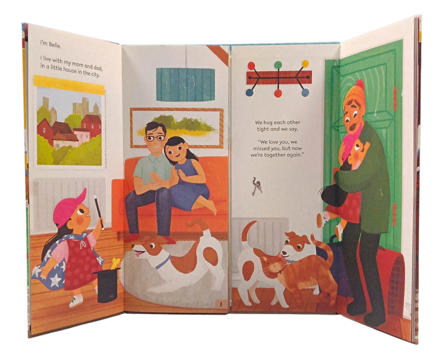 Opening the book reveals two books inside: one that follows Belle in the city, and another that shows us Grandpa Jack in the snowy mountains. The beautifully illustrated stories can be read on their own as well as side-by-side.