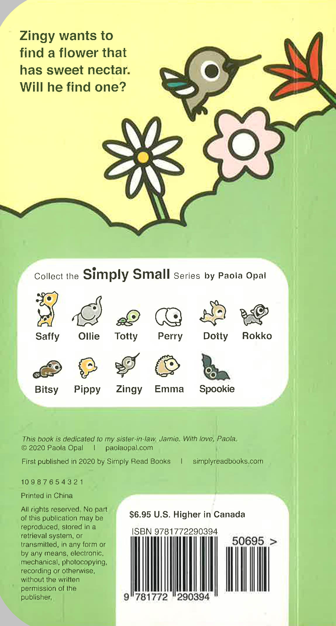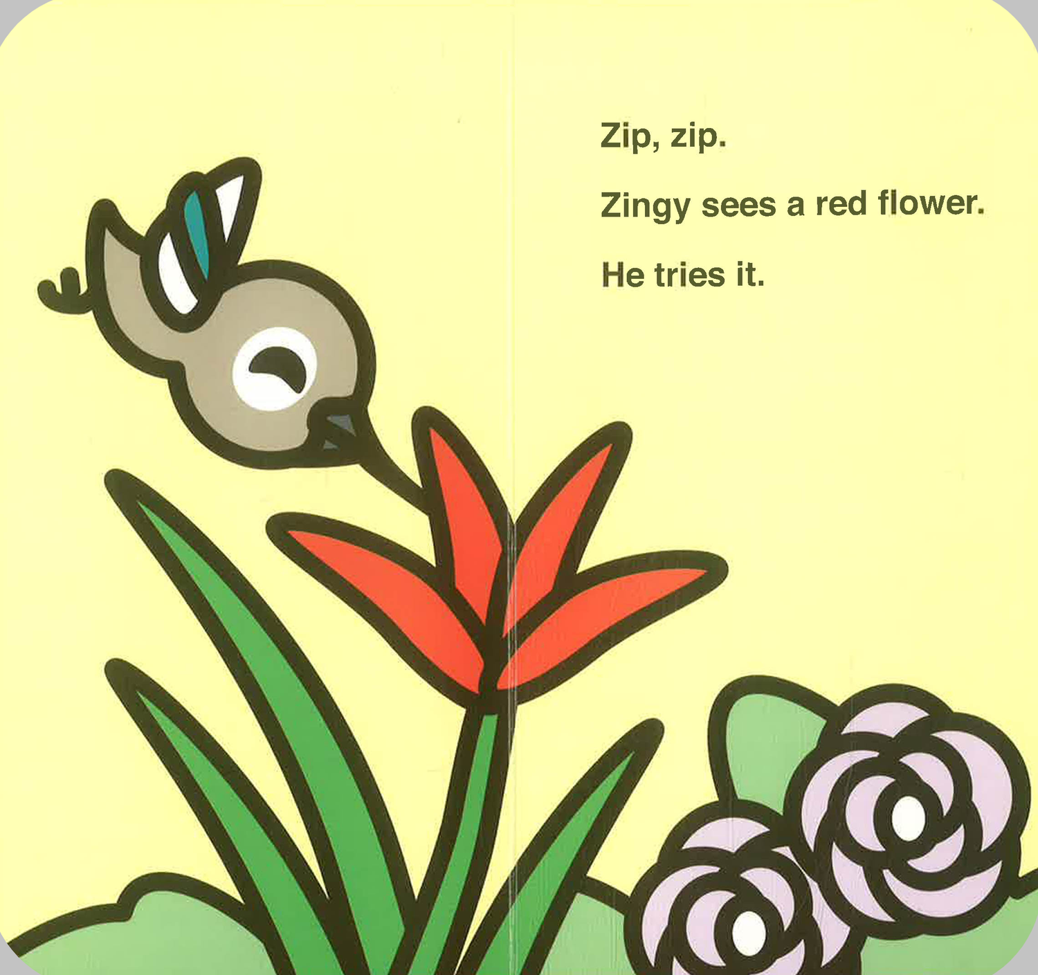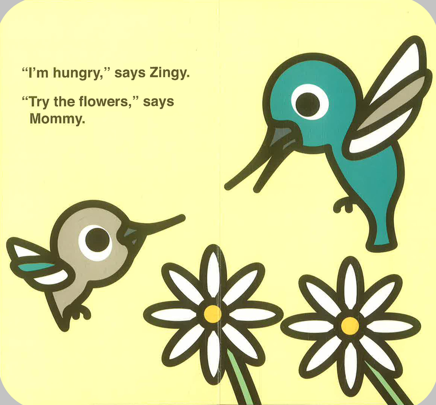 Zingy is a baby hummingbird who wants to find a sweet flower all by herself. Mommy gives her a hint -- she tells Zingy what shape of flower to look for. Will Zingy be able to find the right flower based on Mommy's hint? This story not only celebrates the determination of a little hummingbird, inspiring toddlers to try to do things for themselves, it also teaches toddlers various shapes.