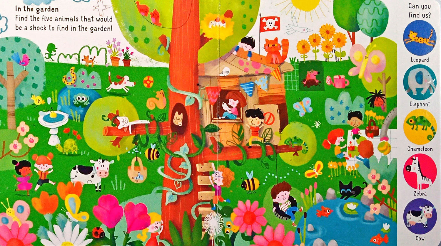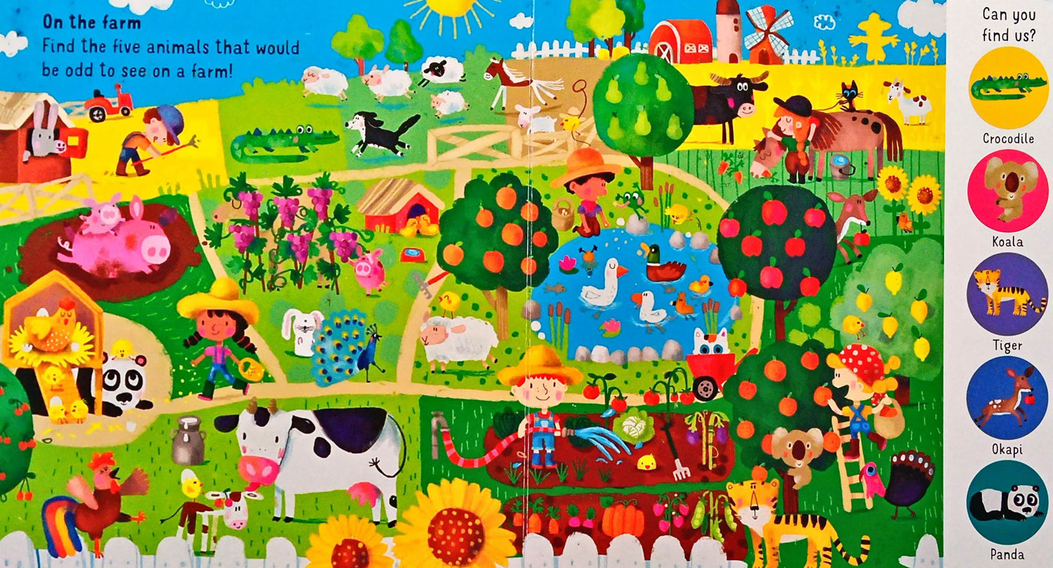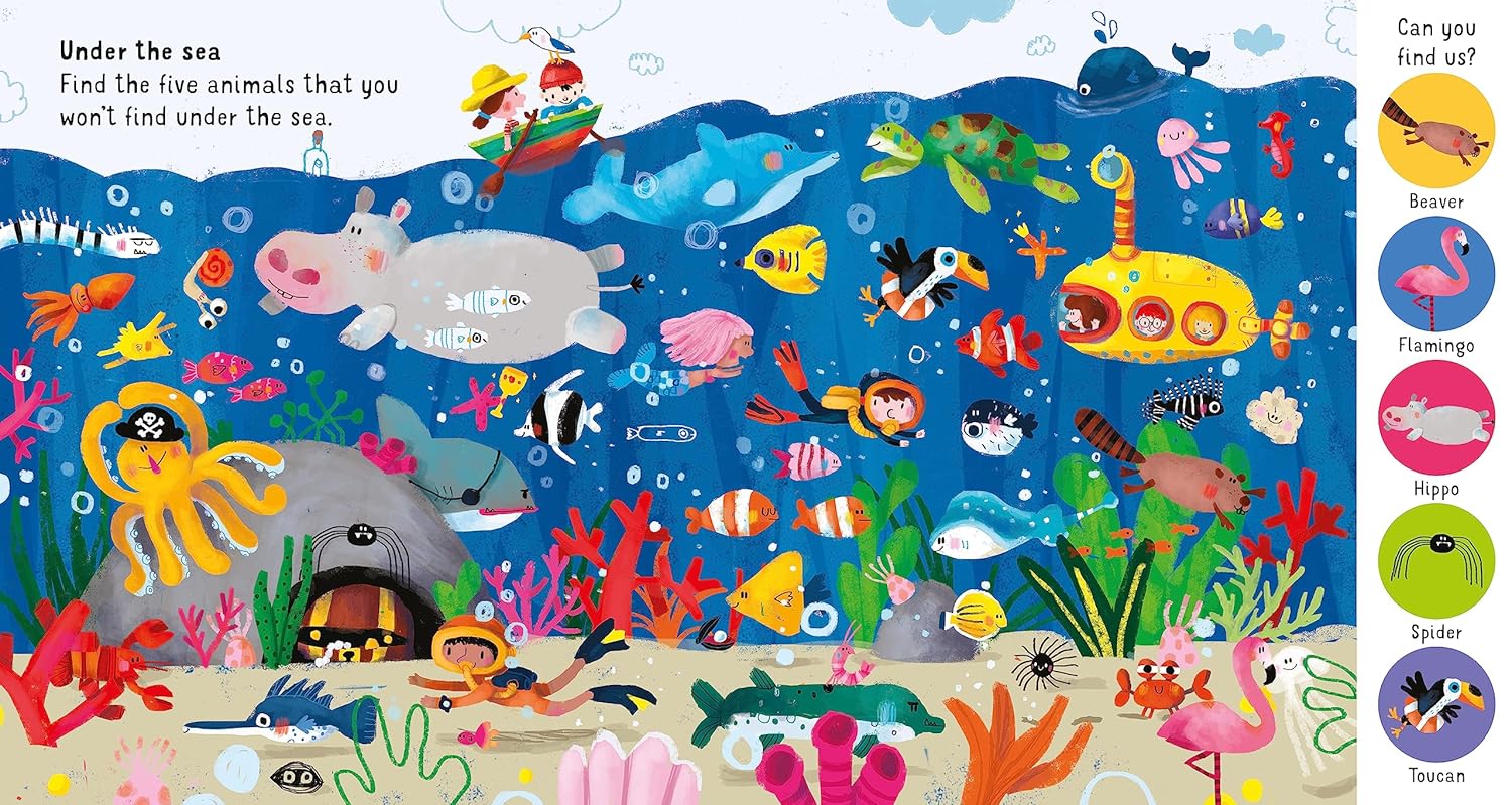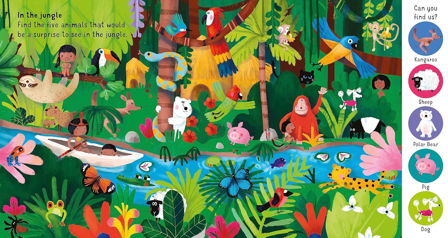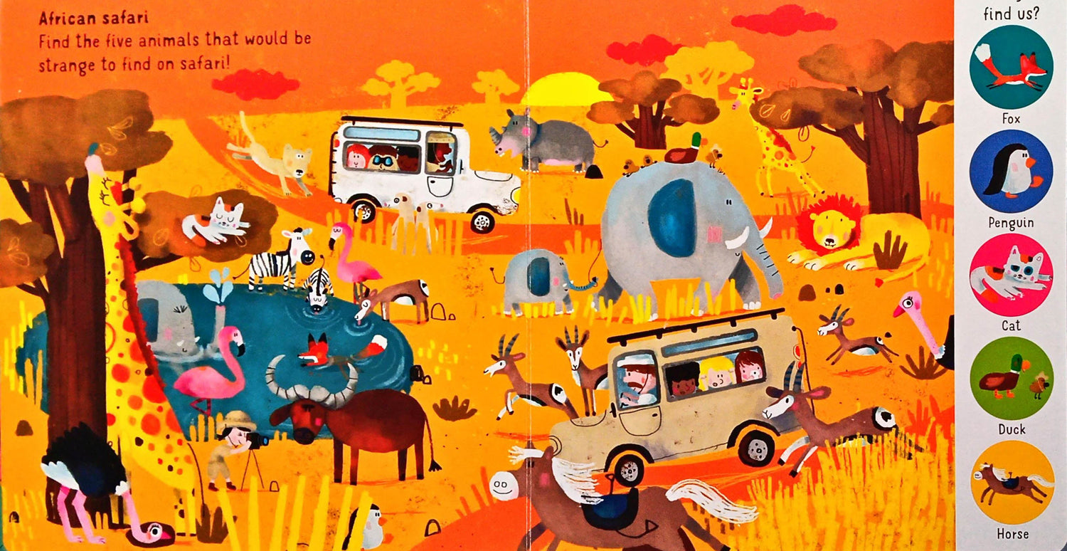 This joyful book introduces young children to the idea of different environments. Each double-page spread has five animals to find that are not in their usual habitats. No matter how hard you look, there's always something more to find and talk about. Full of humour and life, Sophia Touliatou's fabulous illustrations are a riot of colour and detail to discuss with pre-school children to get them thinking about where animals live. * Vibrant, colourful artwork by award-winning illustrator Sophia Touliatou * Develops understanding of the world * An interactive reading experience * Perfect picture-spotting book for pre-school * Lots of detail to talk about in the page