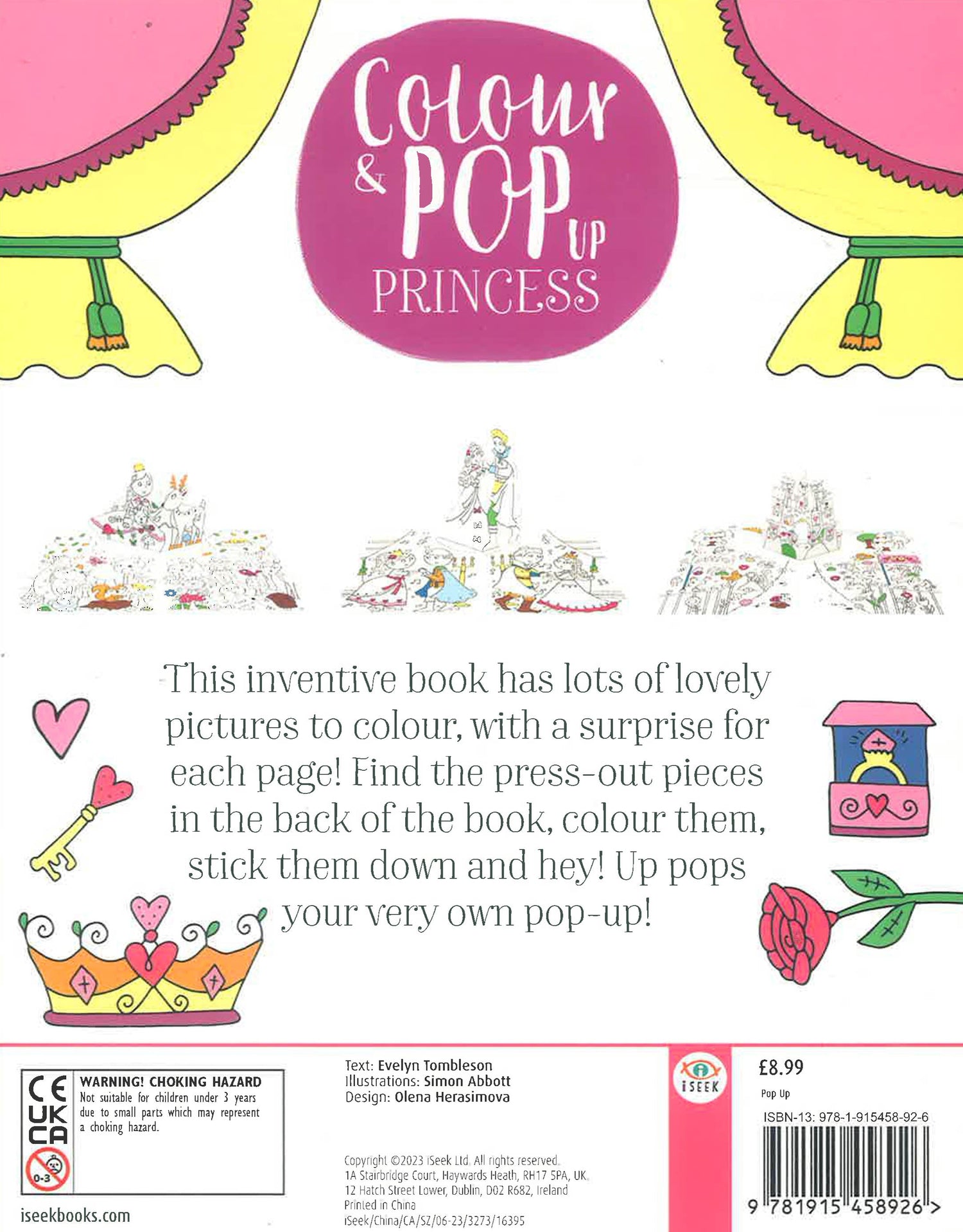 This new addition to the popular Colour & Pop series combines all the fun of pop-up and colouring books. Cheerful and entertaining fairytale princess scenes to colour and eight sets of simple press-out pieces that can be glued to the book to create amazing pop-ups. * Rewarding activity book that builds skills and confidence. * Combines two popular formats in one book. * Pop-up pieces are stored in a wallet at the back of the book. * Personalised pop-up book created on completion. * Fairytale and animal characters to inspire young children's imagination.