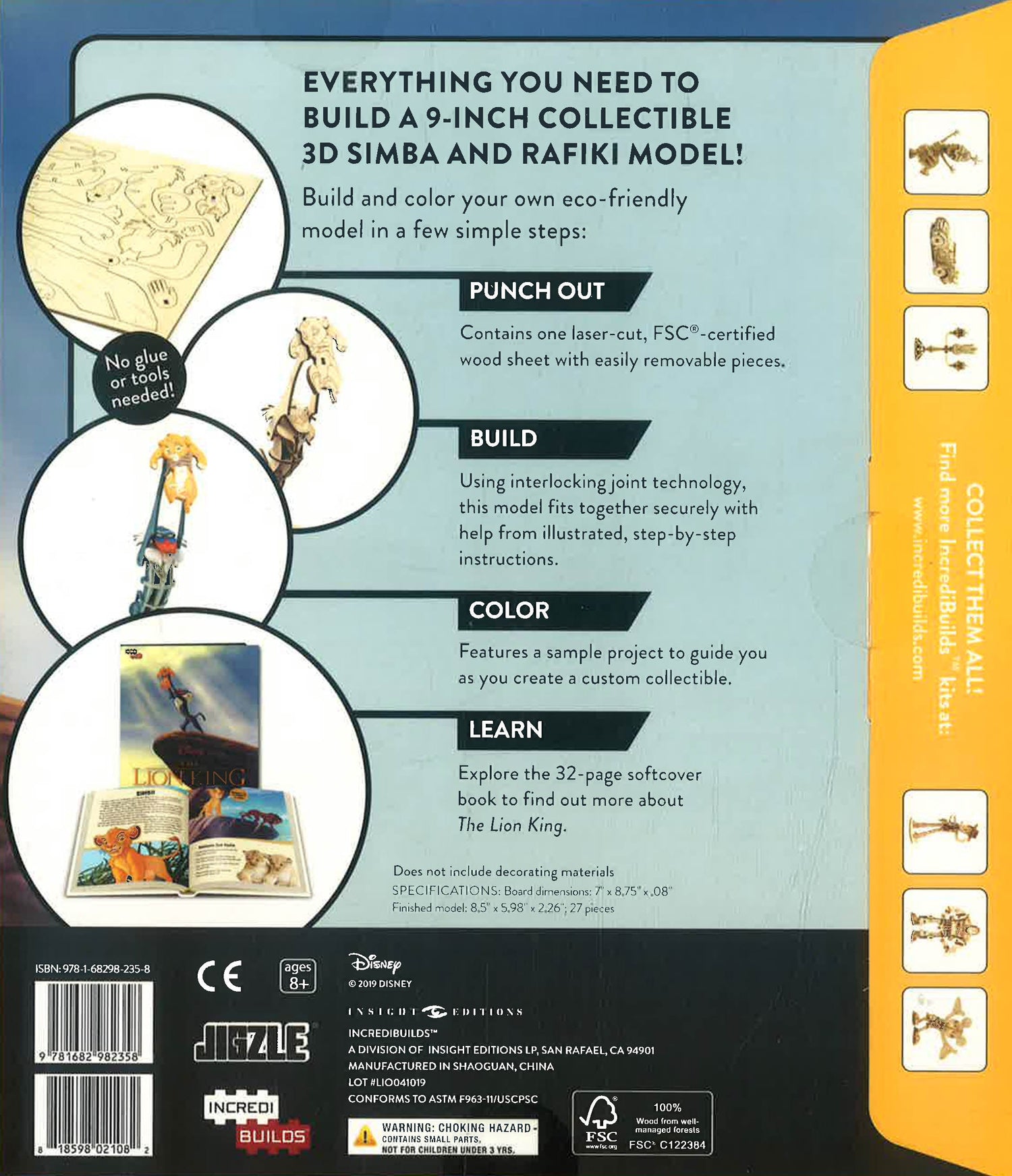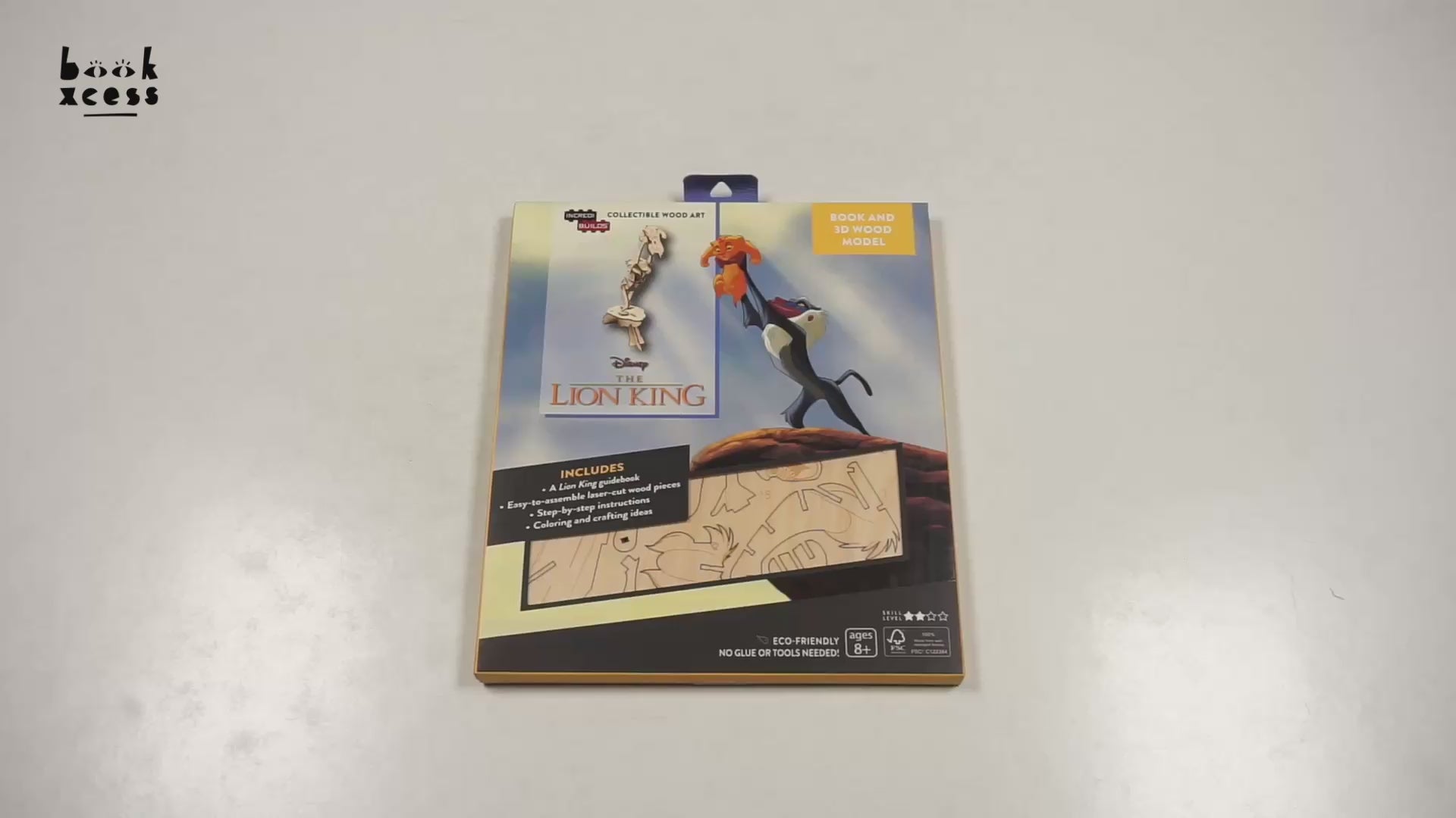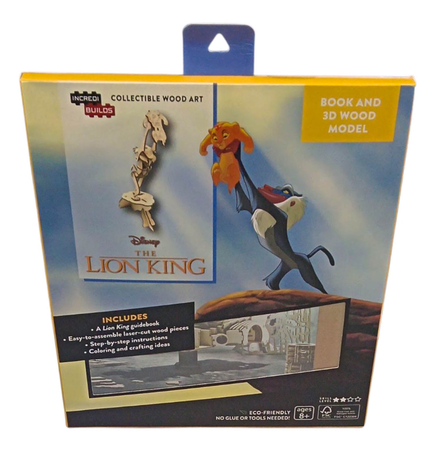"Build and colour your very own 3D model of Rafiki presenting baby Simba to the Pride Lands! Now fans can discover the Pride Lands by building their own 3D wood model of the majestic moment from Disney s The Lion King. In addition to a do-it-yourself, freestanding wood model, included in this set is a fun and informative guide to the film, along with character images and craft ideas that will help you to customize your model. Includes: --Laser-cut, FSC®-certified wood sheet with easy-to-assemble pieces --Step-by-step instructions --Colouring and crafting ideas --A Lion King guidebook "