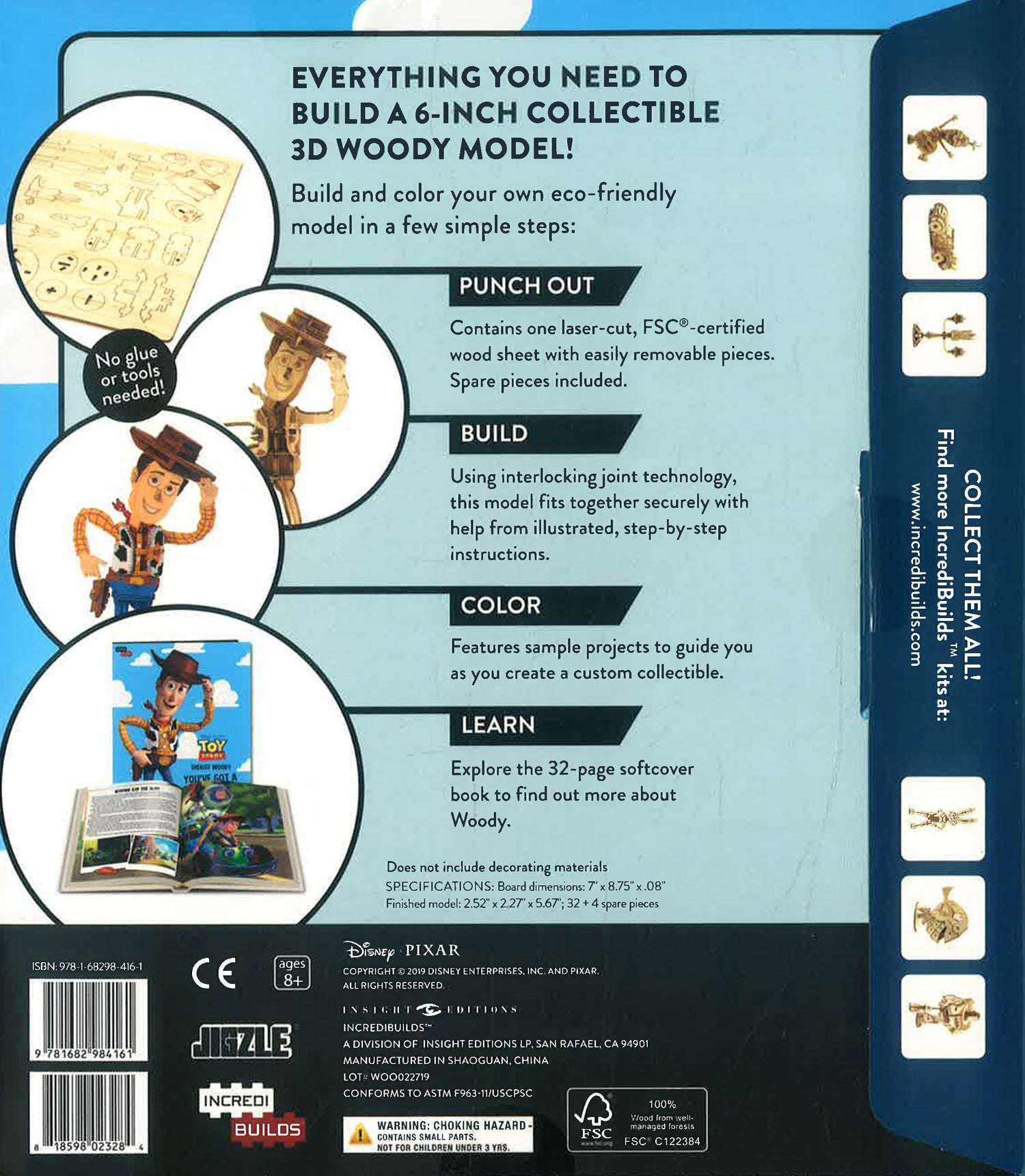 "Build and color your own 3D Woody model! Brave, loyal, and kind to everyone, Woody is one of Andy s favorite toys. He fearlessly leads the toys through many adventures and fun-filled hijinks along with his best friend Buzz Lightyear, of course! Now fans can re-create their favorite Woody moments from the Toy Story films by building their own 3D wood model of the beloved character. In addition to a do-it-yourself, freestanding wood model, each set comes with a fun and informative booklet of character images and facts including an early look at Toy Story 4 as well as craft ideas to help bring your vision to life! Includes: --Laser-cut, FSC-certified wood sheet with easy-to-assemble pieces --Step-by-step instructions --Coloring and crafting ideas --A Woody guidebook "