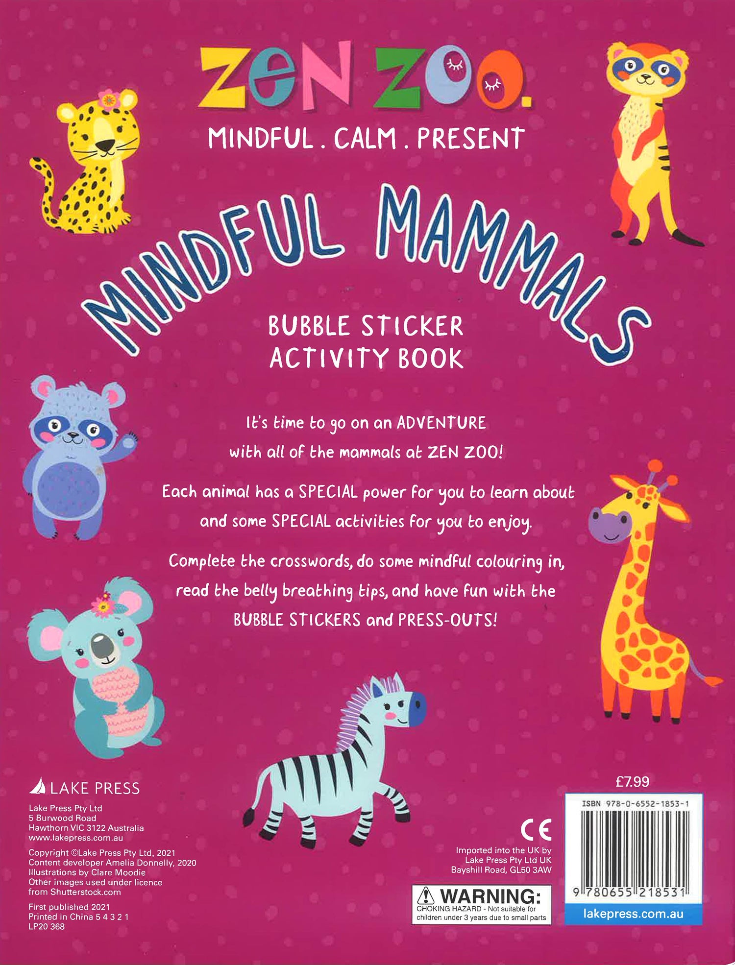 We invite you to explore, dive in and come on an adventure with all the different mammals at the Zen Zoo. Each animal has a special power for you to learn about and a special activity for you to complete. Including crosswords, mindful colouring in, muscle relaxation practise and bubble stickers to enjoy, there are hours of fun to be had! There are also 8 pages of press-out pieces, perfect for children to get crafty and create mammal models. This book comes with a bonus sheet of bubble stickers for children to use however and wherever they like!